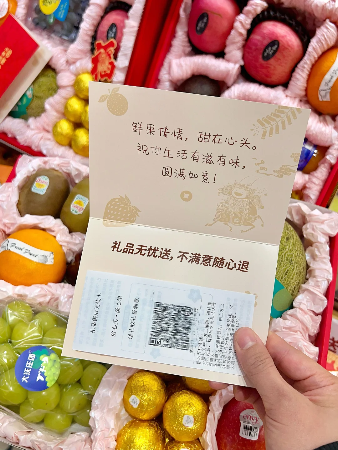 礼盒还附带专属礼品无忧送服务卡,收礼人遇到水果品质问题可自行售后!真的不要太贴心了!送礼好吃有倍有面,我妈都夸我会买!