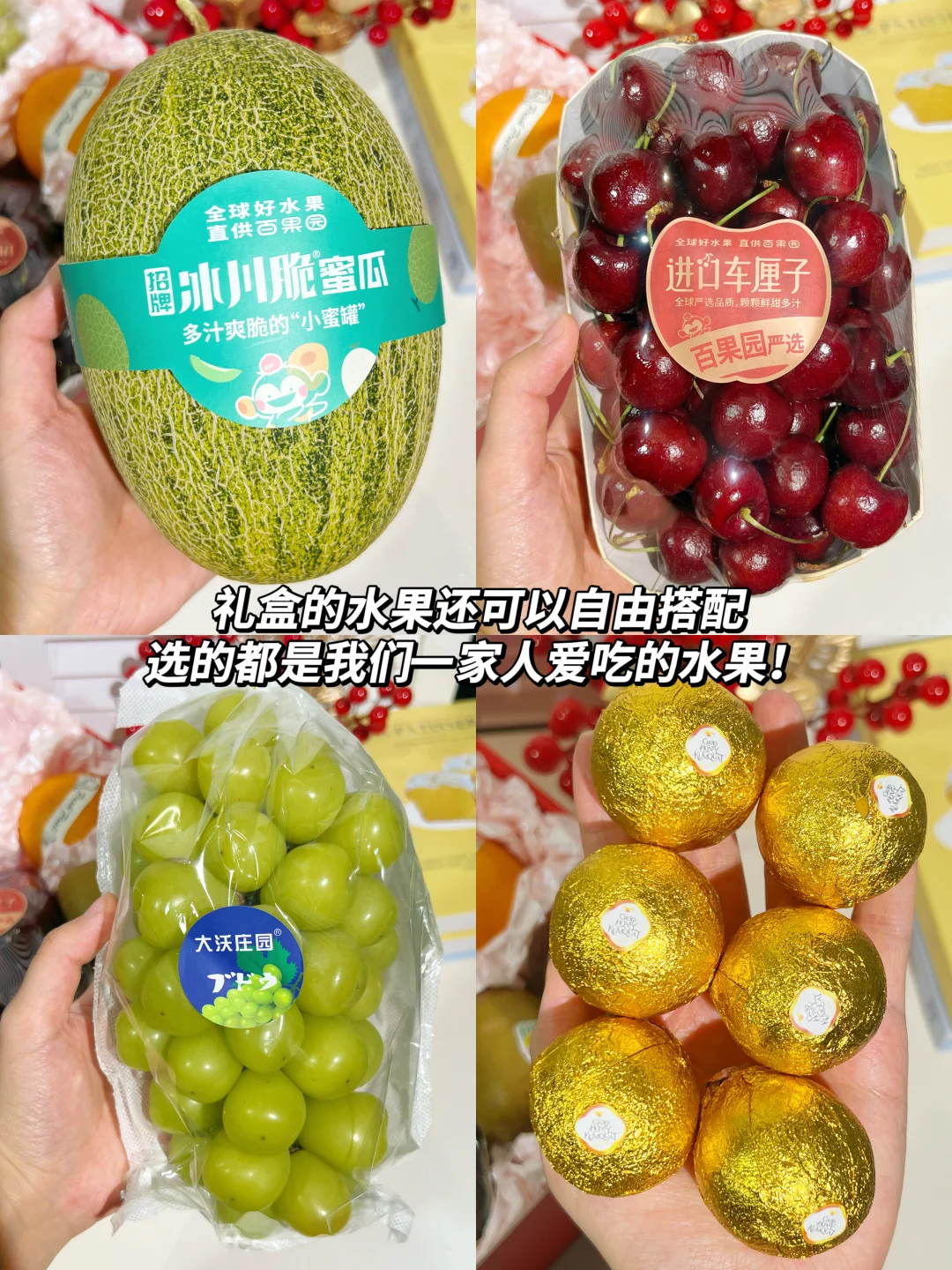 礼盒的水果还可以自由搭配哦,我这一盒就搭配了7款不同的时令水果,招牌冰川脆密瓜、进口车厘子、阳光玫瑰青提、A级脆蜜金桔、A级进口爱妃苹果、A级佳沛金奇异果和A级象山红美人蜜柑,都是我们一家人爱吃的,一次性满足全家的口味,春节水果百果园全包啦