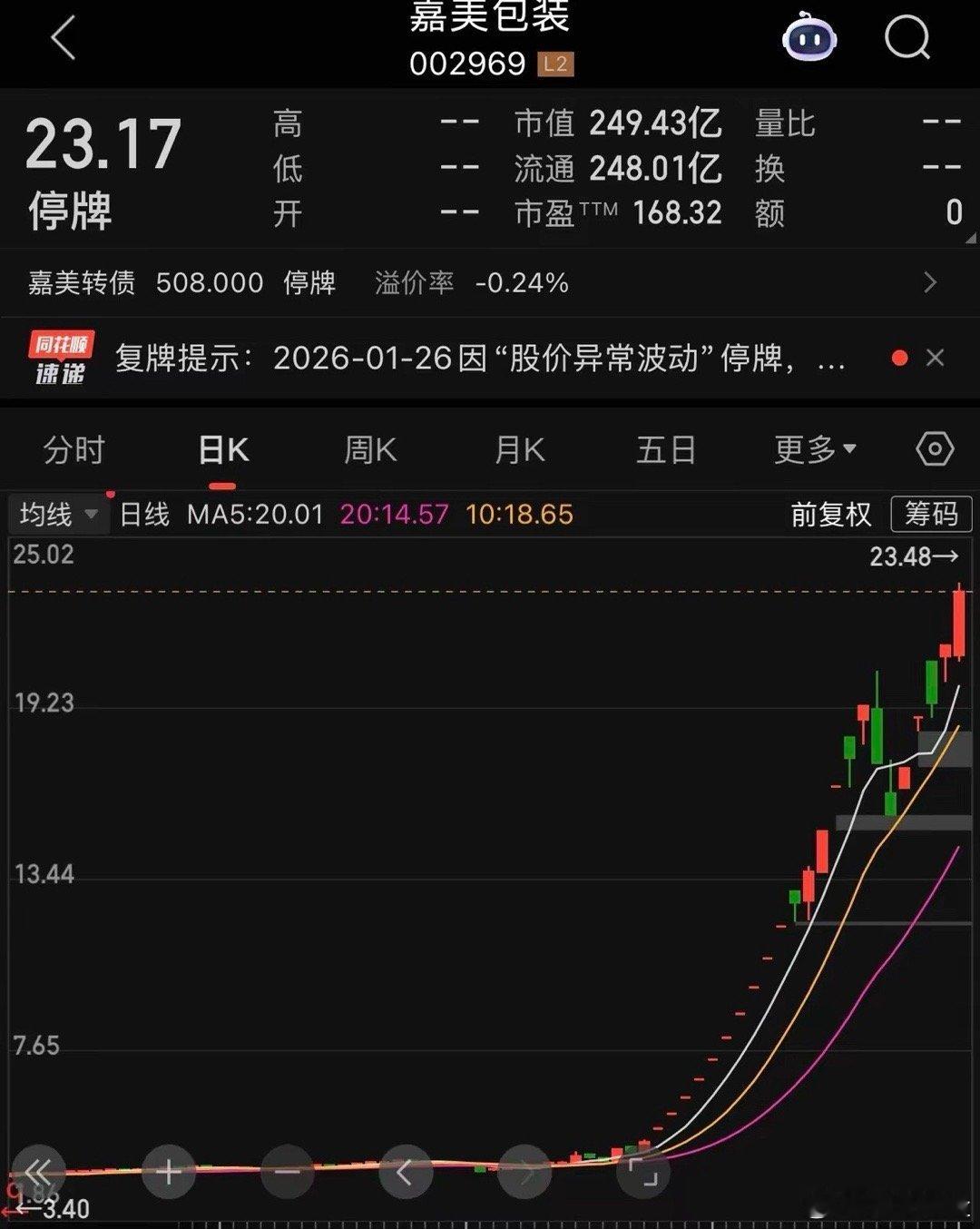 个股消息,明天(2026年2月2日)将有三只个股复牌,民爆光电(301362)、嘉美包装(002969)和锋龙股份(002931)。民爆光电(301362)因筹划发行股份及支付现金购买资产并募集配套资金事项停牌,现已披露重组预案。拟收购厦芝精密100%股权(现金收购51%+发行股份收购49%),切入高端PCB钻针领域,目标抢占AI服务器板钻针市场份额。标的公司具备50倍径钻针量产能力,与胜宏科技、深南电路等头部客户合作,核心技术竞争力提升。同步推进惠州LED工业照明基地建设(投资3.44亿元),以支撑主业增长。嘉美包装(002969)因股价异常波动(2025年12月17日至2026年1月23日涨幅达408.11%)停牌核查结束。公司主营业务仍为食品饮料包装容器,未来12个月内无重大变化,但2025年净利润预计同比下降53.38%-43.02%。苏州逐越鸿智承诺36个月内不进行资产注入,业务独立性明确。锋龙股份(002931)因股价异常波动(18连板涨幅456.34%)停牌核查结束。公司称不涉及人形机器人业务,主营业务为园林机械零部件等。优必选承诺36个月内不注入资产,交易不确定性增高。目前深交所已暂停部分异常交易投资者账户,复牌后要注意炒作情绪退潮。