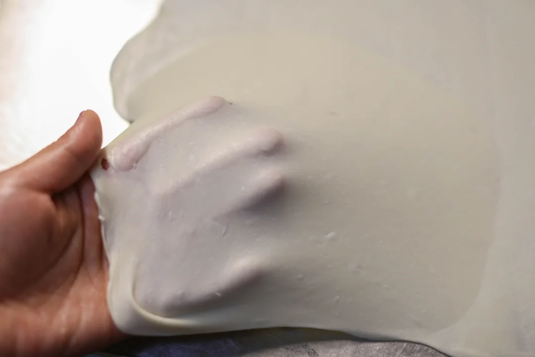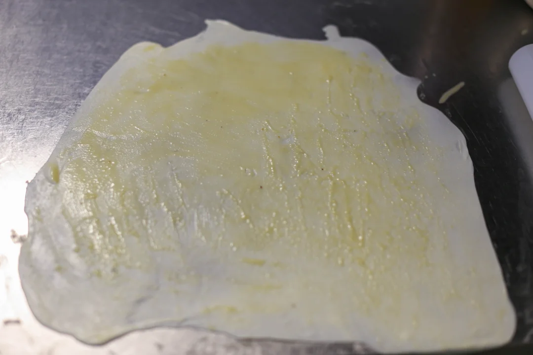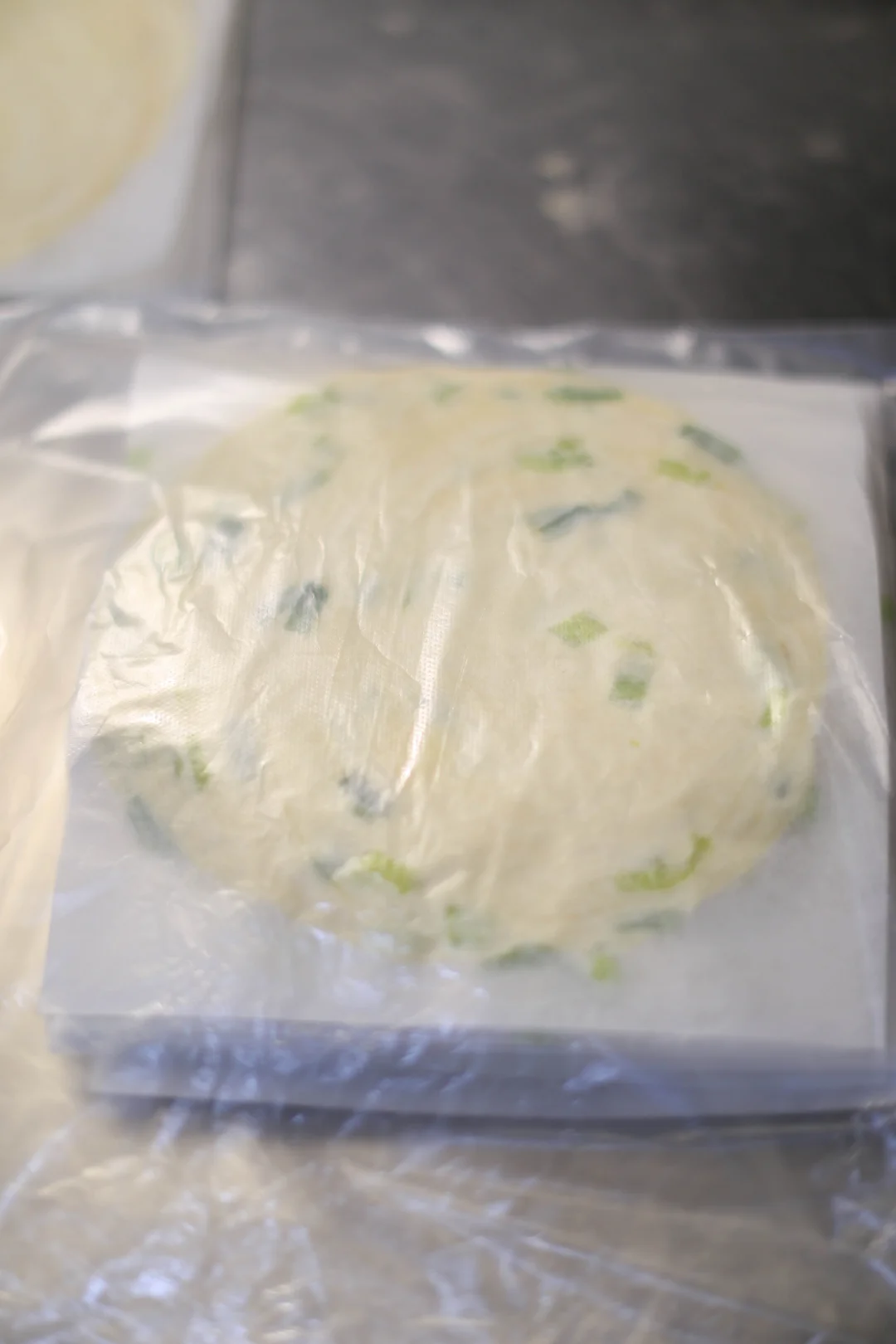 5️⃣:饧发完了之后,可以两手托着,往两边均匀用力拉开,一边从左到右,一边从右到左卷起来,然后叠加起来,就是饼胚,饧发10分钟之后,擀成薄薄的面饼。 (冷冻的话,就用一个圆的物体把饼胚压扁、压圆,隔上油纸,密封冷冻就可以。