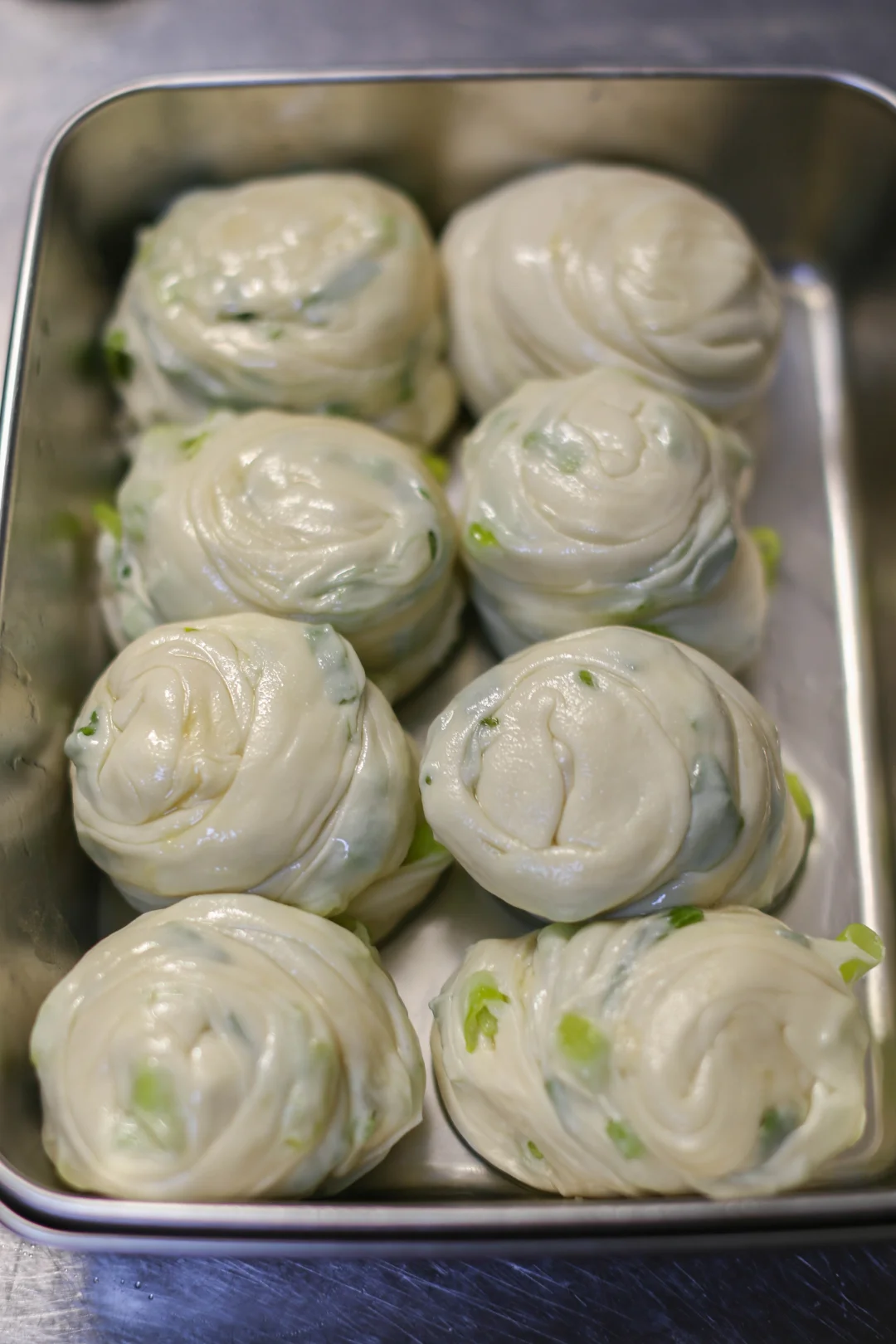 4️⃣:面剂子饧发之后,在面板上抹上一层食用油,放在面板上,擀成薄片,尽可能擀的越薄越好,涂抹上油酥,从上到下卷起来,放在一边饧发5分钟,这是原味手抓饼。2:涂抹油酥,撒上葱花,从上到下卷起来,这是葱花手抓饼。 3:涂抹油酥,放上梅干菜肉