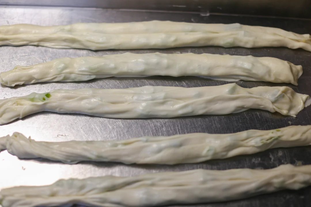 沫馅心,从上到下卷起来,这是梅干菜肉饼。
