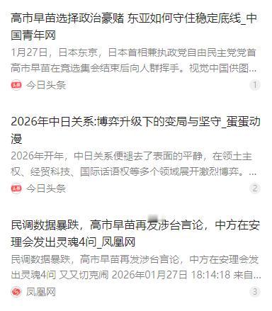 日本现在是真的急眼了!首相苦苦哀求要通电话,结果被北京直接拒之门外,吃了闭门羹。外务大臣昨晚竟然在网上“卖惨”,倒打一耙说我们打“历史牌”。简直是天大的笑话!自己先点火,被烟呛到了还要怪别人?这出闹剧背后,真正的暴风雨才刚刚开始。 麻烦看官老爷们右上角点击一下“关注”,既方便您进行讨论和分享,又能给您带来不一样的参与感,感谢您的支持! 2026 年开年中日关系持续紧张,日本首相高市早苗主动向中方提出高层通电话的请求,却被中方直接拒绝,这记闭门羹让日方的外交姿态显得格外尴尬。碰壁之后,日本外务大臣接连在网络发声,不仅对中方的拒绝表达不满,还倒打一耙指责中方借历史问题制造矛盾。 日方这番言论完全是混淆是非的无理说辞,明眼人都能看出,不是中方在打历史牌,而是日方始终在历史和台湾问题上触碰中国底线。中方的拒绝从不是凭空而为,而是对日方一系列错误行径的正当回应,更是清晰传递出中国在核心利益上的坚定立场。 日本右翼势力近年来不断美化侵略历史、篡改历史教科书,甚至纵容政客参拜靖国神社,这些行为早已伤害了中国人民的情感,也让中方对中日高层对话持谨慎态度。更过分的是,日方在台湾问题上屡屡越界,公然违背中日四个政治文件的原则。 中国常驻联合国代表傅聪第一时间对日本的无理指责予以强硬回击,明确指出日方插手台湾问题的行为,是对中国内政的严重干涉,更是对台海地区和平稳定的破坏。傅聪同时向日方发出严正警告,若日方继续纵容 “台独” 势力,必将面临中方更加强硬的反制,承受严峻后果。 作为日本现首相的高市早苗,更是涉台错误言论的始作俑者。她多次公开发表支持台湾的言论,甚至抛出 “台湾有事就是日本有事” 的危险论调,公然挑战战后国际秩序,将台湾问题当作博取政治资本的筹码。 高市早苗的一系列操作,本质上是为了迎合日本国内保守派选民,为即将到来的选举铺路。2026 年 2 月 8 日日本将举行众议院选举,这场提前进行的大选被视作日本政局的重要转折点,高市早苗想靠打 “台湾牌” 稳固自己的政治地位。 可她的激进做法,不仅让中日关系的紧张局势持续升级,也让日本国内付出了不小的代价。日本商界早已对此表达强烈不满,因为中方的反制措施让日本众多行业遭受冲击,稀土等核心材料的出口管制,让日本车企、半导体企业陷入生产停滞。 日本经济对中国市场的依赖程度本就极高,71.9% 的稀土进口来自中国,重稀土更是 100% 依赖,中方的精准反制直接击中了日本高端制造业的命门。据日方测算,相关材料供应中断可能让日本产生高达 53 万亿日元的生产损失。 除了经济层面的冲击,高市早苗的对华强硬路线也让日本内政陷入动荡。她宣布提前大选后,个人支持率出现明显下滑,跌幅在 4 至 10 个百分点之间,有 41% 的日本民众明确反对此时解散议会,认为此举损害了国家治理的连续性。 日本在野党也对高市早苗的政策提出诸多质疑,指出她解散众议院是为了回避经济政策失效、中日关系恶化等亟待回应的关键问题。如今的日本政坛,自民党仅靠执政联盟勉强维持多数席位,高市早苗的执政根基本就薄弱。 日方一边做出想要对话的虚假姿态,一边却在持续推进危害中日关系的行为。高市早苗政府不仅没有收回涉台错误言论,还在不断提升防卫预算,2026 财年防卫预算飙升至 9.04 万亿日元,创下历史新高,彻底背离 “专守防卫” 原则。 日方还计划修订 “安保三文件”,模糊 “无核三原则”,甚至在西南诸岛部署远程导弹,一系列军事化操作让亚太地区的安全形势持续承压。中方始终认为,对话的前提是日方拿出诚意,用实际行动纠正错误,而不是嘴上喊着对话,行动上却不断挑衅。 中方拒绝对日高层对话,就是要让日方认清现实,在历史问题上正视并反省,在台湾问题上恪守一个中国原则,这是中日关系发展的政治基础,没有任何讨价还价的余地。日方如果始终执迷不悟,只会让自己的外交困境愈发严重。 对于日本而言,2026 年的这场选举不仅决定着国内的政治走向,也深刻影响着中日关系的未来。如果日方继续在历史和台湾问题上挑战中国核心利益,中方的反制力度只会越来越大,日方将遭遇更沉重的外交和经济压力。 日本国内的有识之士早已看清,高市早苗的政治豪赌没有任何出路,打 “台湾牌” 最终只会反噬自身。中日两国一衣带水,合则两利,斗则俱伤,这是早已被历史证明的道理,日方的激进做法,最终损害的还是日本民众的根本利益。 中日关系的走向,始终掌握在日方手中,而亚太地区的和平稳定,也离不开中日两国的共同维护。如果日方真的希望改善中日关系,就必须放弃错误的对华政策,拿出真正的诚意,用实际行动回到中日四个政治文件的正确轨道上来。