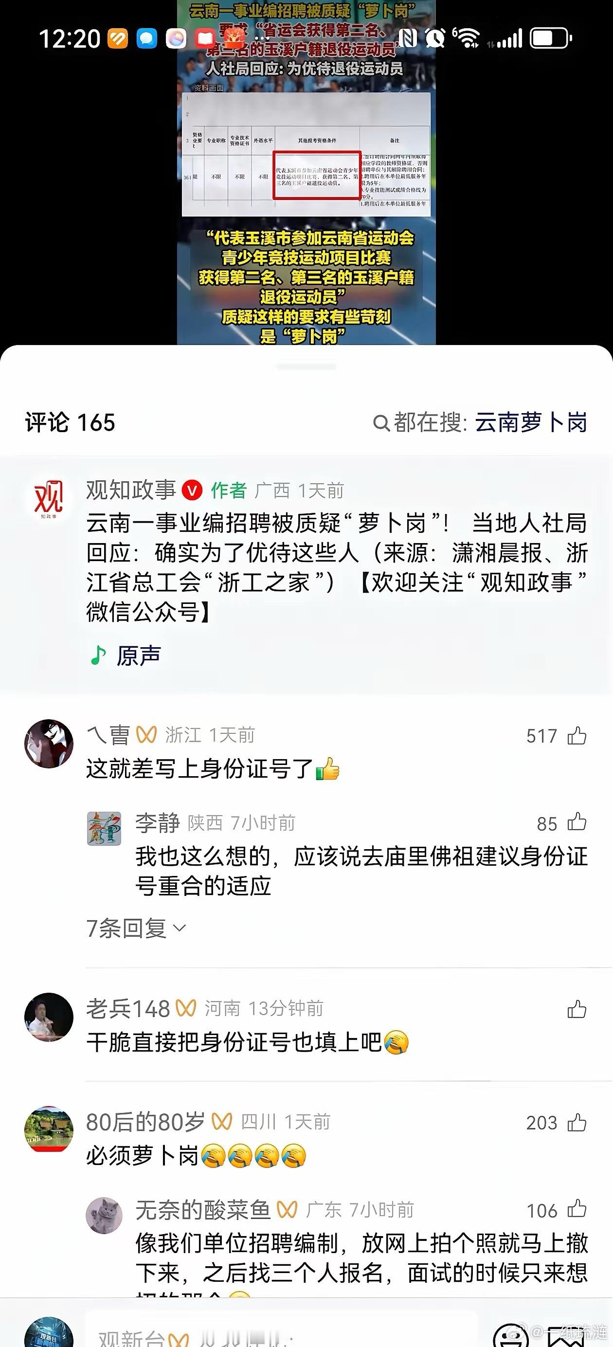 “来,让萝卜岗给大家展示一下啥叫萝卜岗!”???——云南玉溪,一事业编招聘要求“省运会获得二三名的玉溪籍退役运动员”。网友对此评价:“你干脆直接报人身份证号得了”。。。