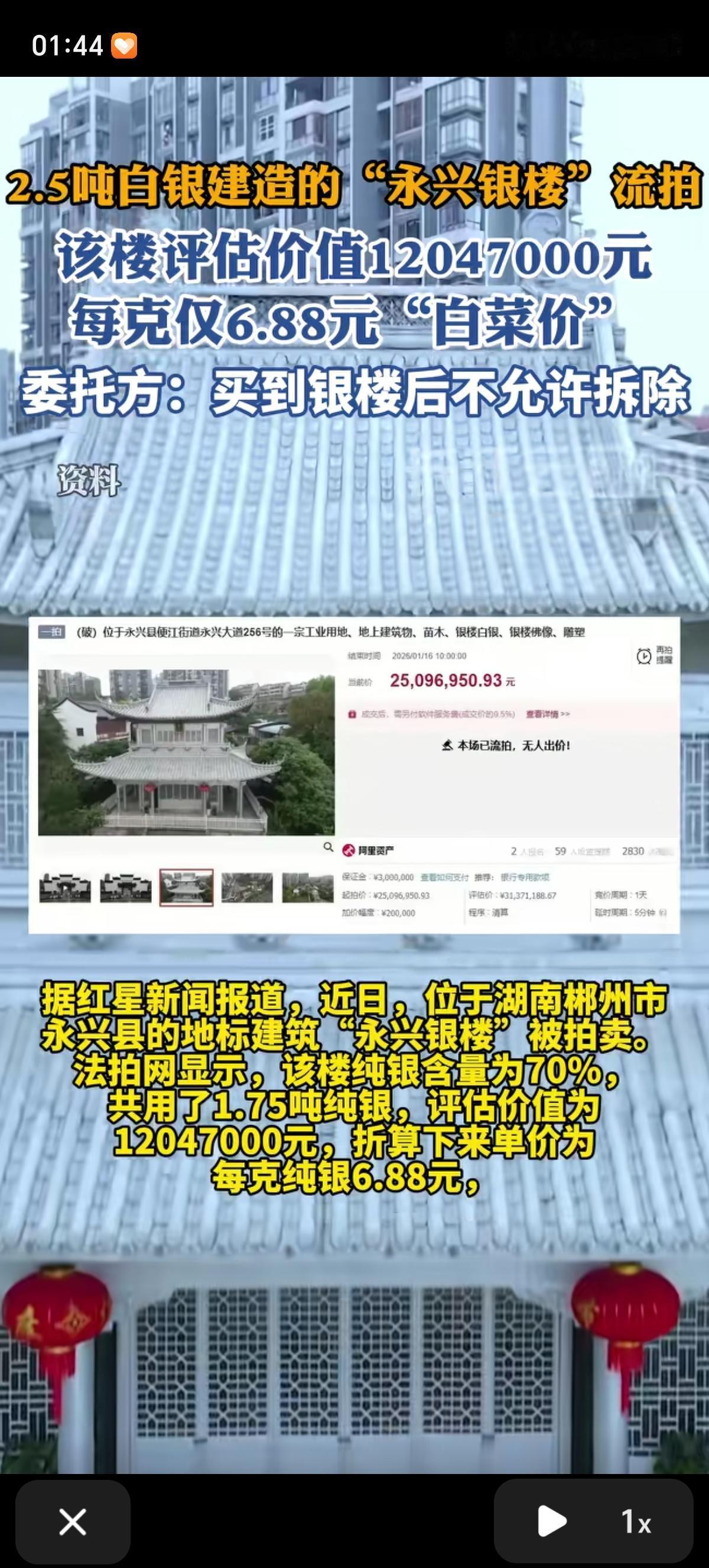 湖南用2.5吨纯银打造的标志性建筑“永兴银楼”流拍了。该楼估价12047000元,每克只要6.88元,可谓“白菜价”,委托方要求买到银楼的一方不允许拆除该建筑论斤卖。 近日位于湖南省郴州市永兴县的地标性建筑“永兴银楼”被拍卖。银楼的母公司鑫达银业近年陷入严重的资金困境,资不抵债,只能拍卖。该银楼纯度为70%,共用了1.75吨纯银。整体评估价超3137万元,起拍价约2509.7万元。但在1月16日的拍卖中,尽管有两人报名,最终却因无人出价而流拍。 当时市场上白银价格已超过29元/克,仅这1.75吨纯银的市场价就超过5000万元,远高于银楼的起拍价,算是白菜价了。 此次拍卖并非单独出售银楼,而是将银楼、工业用地、地上建筑、苗木等资产打包处置。 可惜拍卖公告明确要求:买受人必须永久维持银楼“中国白银文化馆”的文旅定位,不得拆除或变更用途。这一限制直接堵死了投资者“拆楼变现”的可能,让只想套利的买家望而却步。