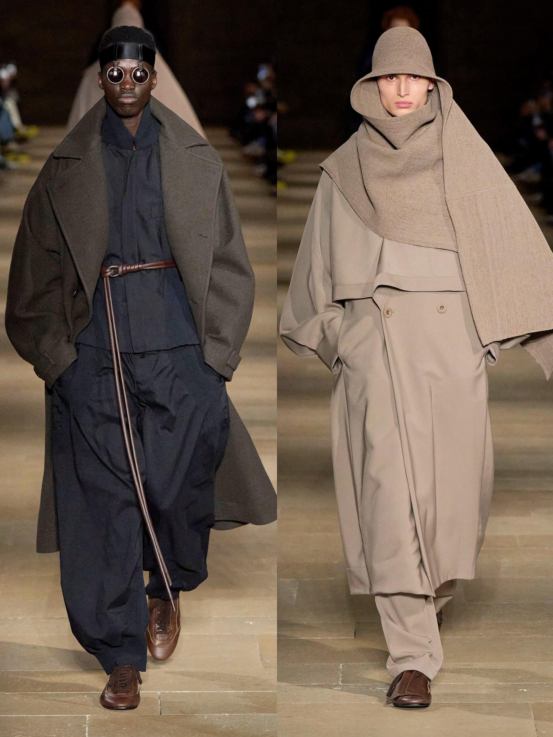 IM MEN作为Issey Miyake男装分支,2026秋冬系列以品牌标志性的“一块布”哲学为核心,书写了一场关于当代男性身体与气质的深度叙事。它不再追问“穿什么”,而是探询“男人该如何存在”。“长度”是本季最直白的设计语言:开场的黑色廓形大衣以超长飘带领带垂至脚踝,用物理延伸塑造视觉张力;夹克外套则通过剪裁与拉链实现“一衣多穿”,可在斗篷与合身外套间自由切换,裤装内衬还能拆成背心,将长度转化为可持续的时间维度。“一块布”的本质是在“最少剪裁”的极限中激发最大创造力。零浪费设计将布料边缘化为天然装饰,可转换结构邀请穿着者参与“二次设计”,在走动时宽大衣摆带出空气感,在重组造型中探索自主与智性,最终达成“衣随人动,心随形游”的优雅状态。