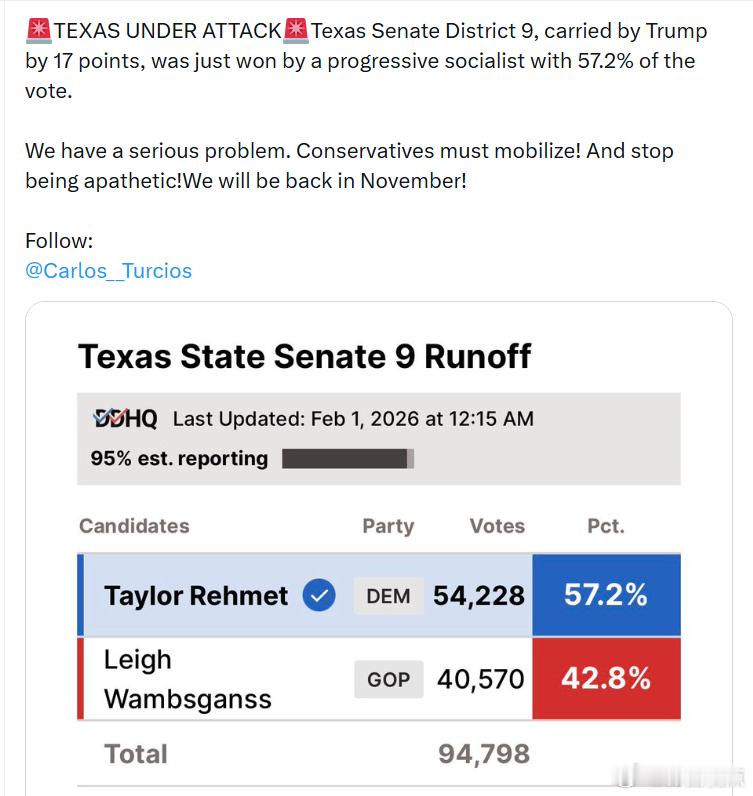 德克萨斯州参议院第 9 选区——特朗普曾以17个百分点优势拿下的选区——刚刚被一名激进民左党人以57.2%的得票率赢得。