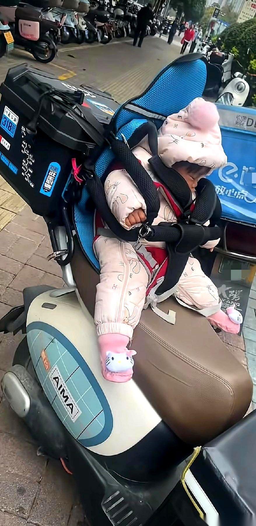 我跟你说,那一瞬间我心都揪起来了。 一辆外卖车停在路边,后座上,一个小脑袋耷拉着
