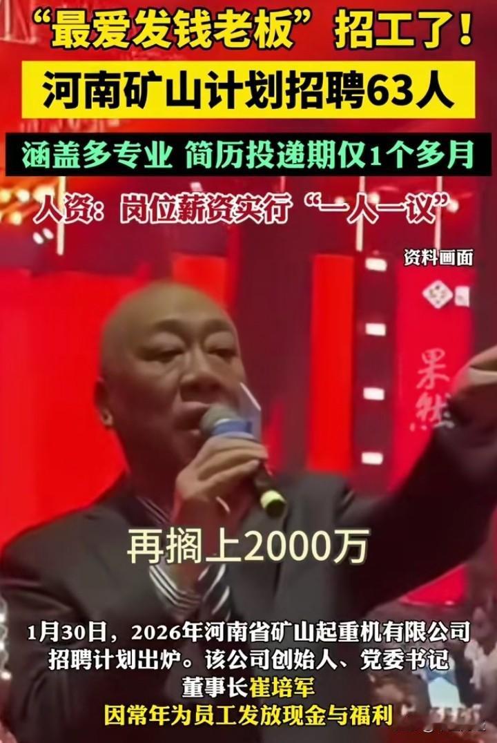 最慷慨发钱的老板开始招人啦!是河南矿山集团的崔培军在招人哟,你们会去吗?瞧瞧他给