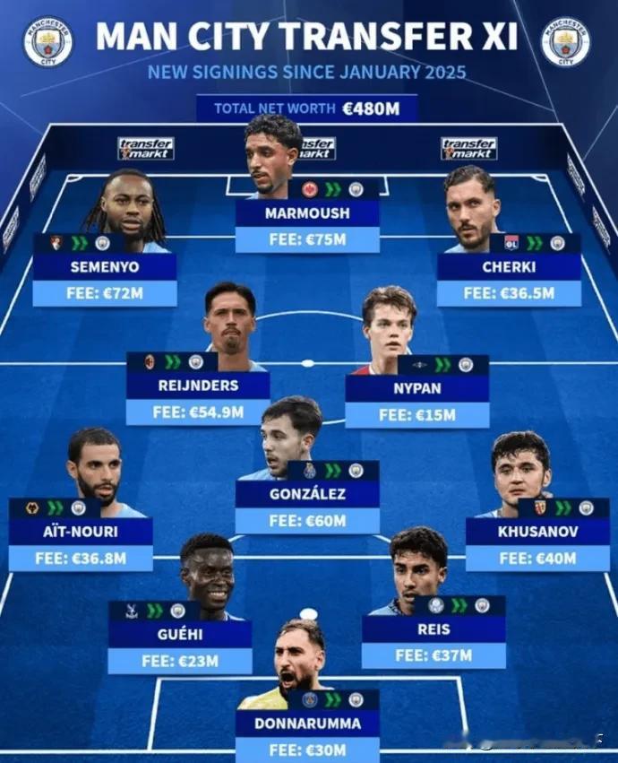 曼城是真土豪啊!1年内豪掷4.8亿买套首发阵容。塞梅尼奥、格伊,多纳鲁马全是高级货啊。 其实这套阵容里的球员,大多数都超值的,就算踢不出来用几年再卖也不会亏。反正年轻都是潜力股。 其实我更好奇的是曼城这套人的工资得有多高? 那哈兰德一个人一年就三个多亿人民币的工资,再加上这套首发球员的工资换做别的队,工资早就爆掉了。 这么多高工资的球员,一般球队是真的养不起。