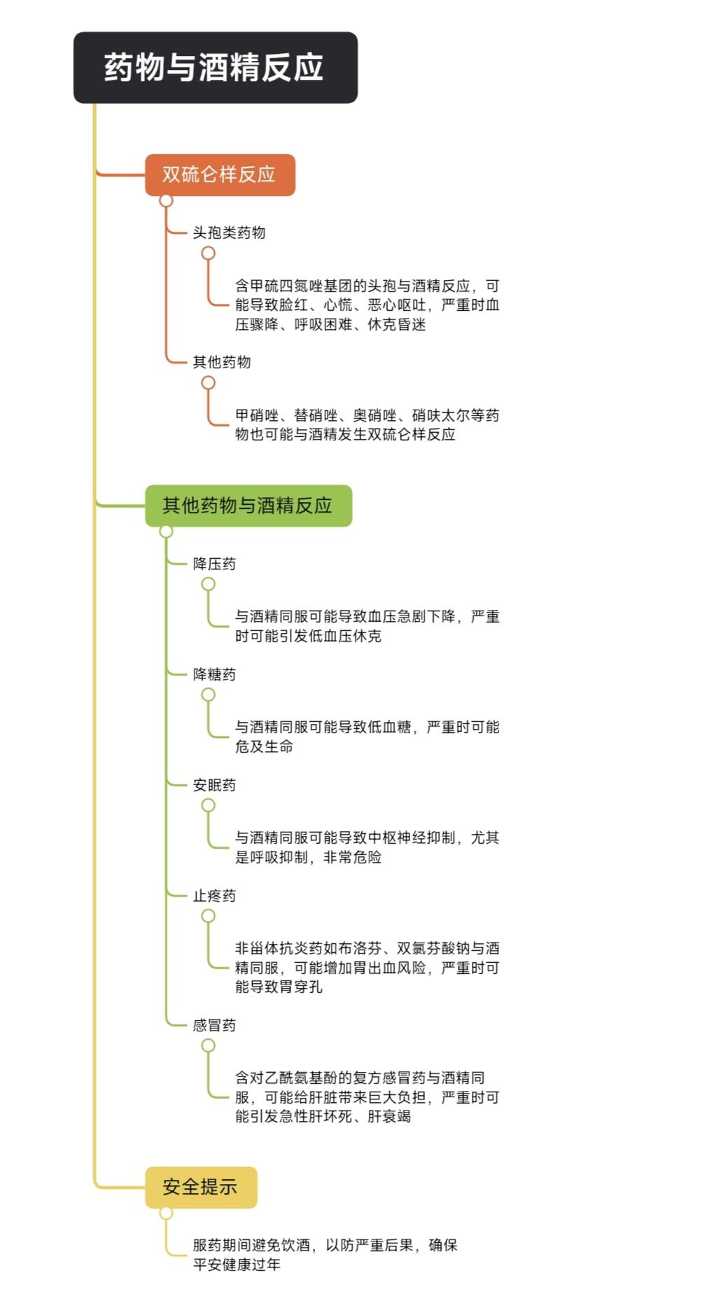 春节前提醒:不止头孢,吃这5种药,也千万别喝酒,可能出现严重后果的! 快过年了,很多人春节的时候,可能会喝酒,但是,大家要知道,不止是头孢,还有这5种药和酒同时服用,也可能会出现严重问题的,甚至危及生命的。 你应该听说过,头孢配酒说走就走。也就是吃了头孢,千万别喝酒了,因为某些头孢含有甲硫四氮唑基团,会和酒精发生双硫仑样反应,轻则脸红、心慌、恶心呕吐,重则血压骤降、呼吸困难、休克昏迷的。 其实会和酒精发生双硫仑样反应的,还有甲硝唑、替硝唑、奥硝唑、硝呋太尔等等。如果您在吃上面提到的这些药物,过年就千万不要喝酒了。 除了双硫仑样反应,还有这5种药物也不建议和酒同服,也可能会出现严重后果的。 第一种,降压药和酒同时服用,有可能导致血压急剧下降,严重的甚至可能导致低血压休克,危及生命。 第二种,降糖药和酒,可能会导致低血糖的,严重的低血糖,短时间内可能是要命的,如果真的出现低血糖,要尽快补充糖分的。 第三种,安眠药和酒不要一起吃,两者一起用,会导致中枢神经抑制的,尤其是呼吸抑制,非常危险。 第四种,止疼药和酒,尤其是非甾体抗炎药,比如布洛芬、双氯芬酸钠等,这些止疼药会刺激胃黏膜,加上酒精本身也伤胃,双重作用下,很可能增加胃出血风险,甚至导致胃穿孔的。 第五种,感冒药和酒,很多复方感冒药里含对乙酰氨基酚,对乙酰氨基酚主要在肝脏代谢的,而酒精也需要在肝脏代谢,两者一起用,给肝脏带来巨大负担,严重的可能引发急性肝坏死、肝衰竭的。 总之啊,过年喝酒虽常难免,但如果你正在服药,真的不建议同时喝酒,以上提到的这些情况,一旦发生,都可能带来严重后果,甚至危及生命的。希望大家都能平安健康,过个好年,春节快乐! 药学科普,仅供参考