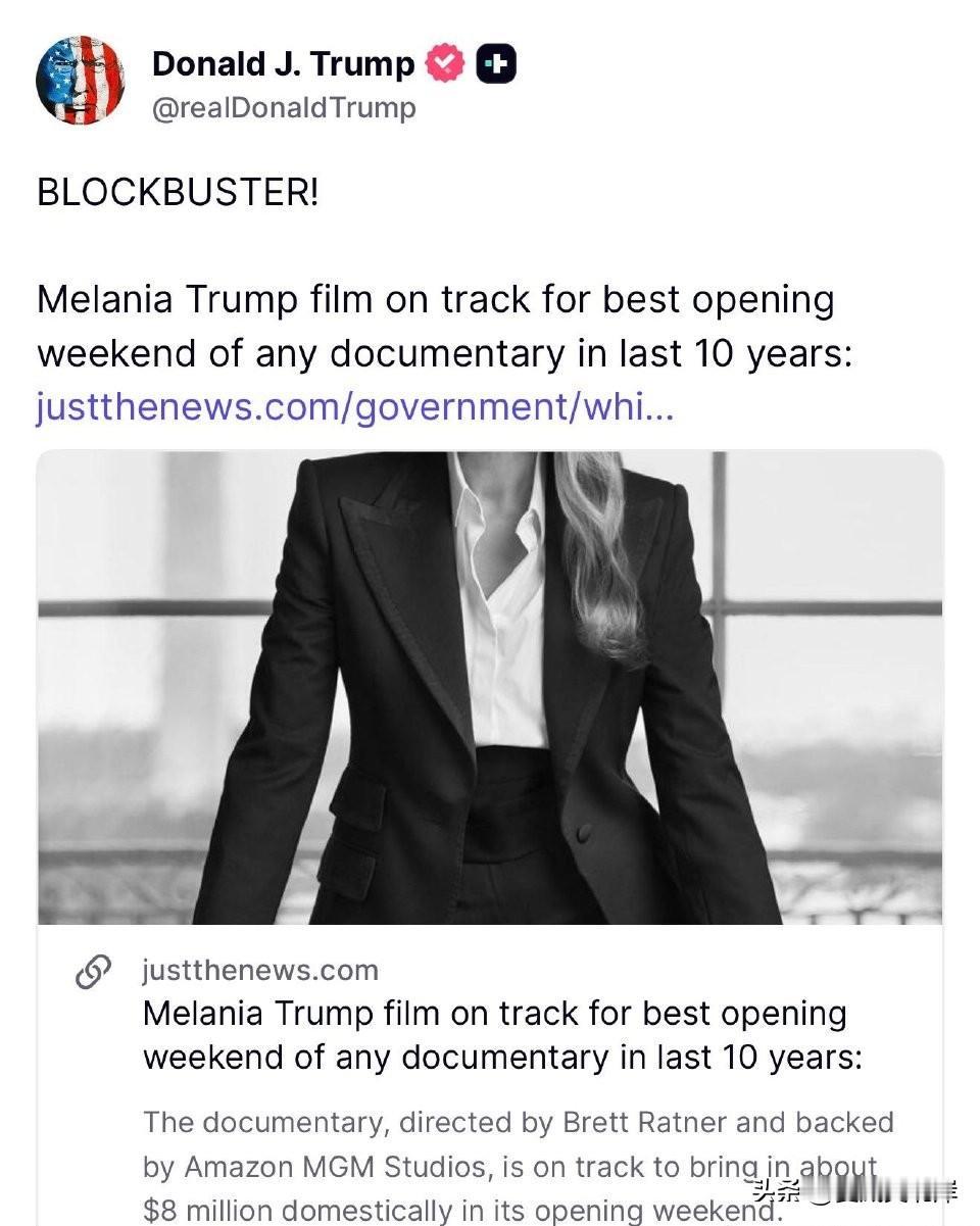 川普发文为其老婆的纪录片做宣传,据报该纪录片的首周末票房有望超过800万美元。 “重磅炸弹! 关于Melania Trump的电影有望成为近10年来任何纪录片的最佳开画周末票房。”