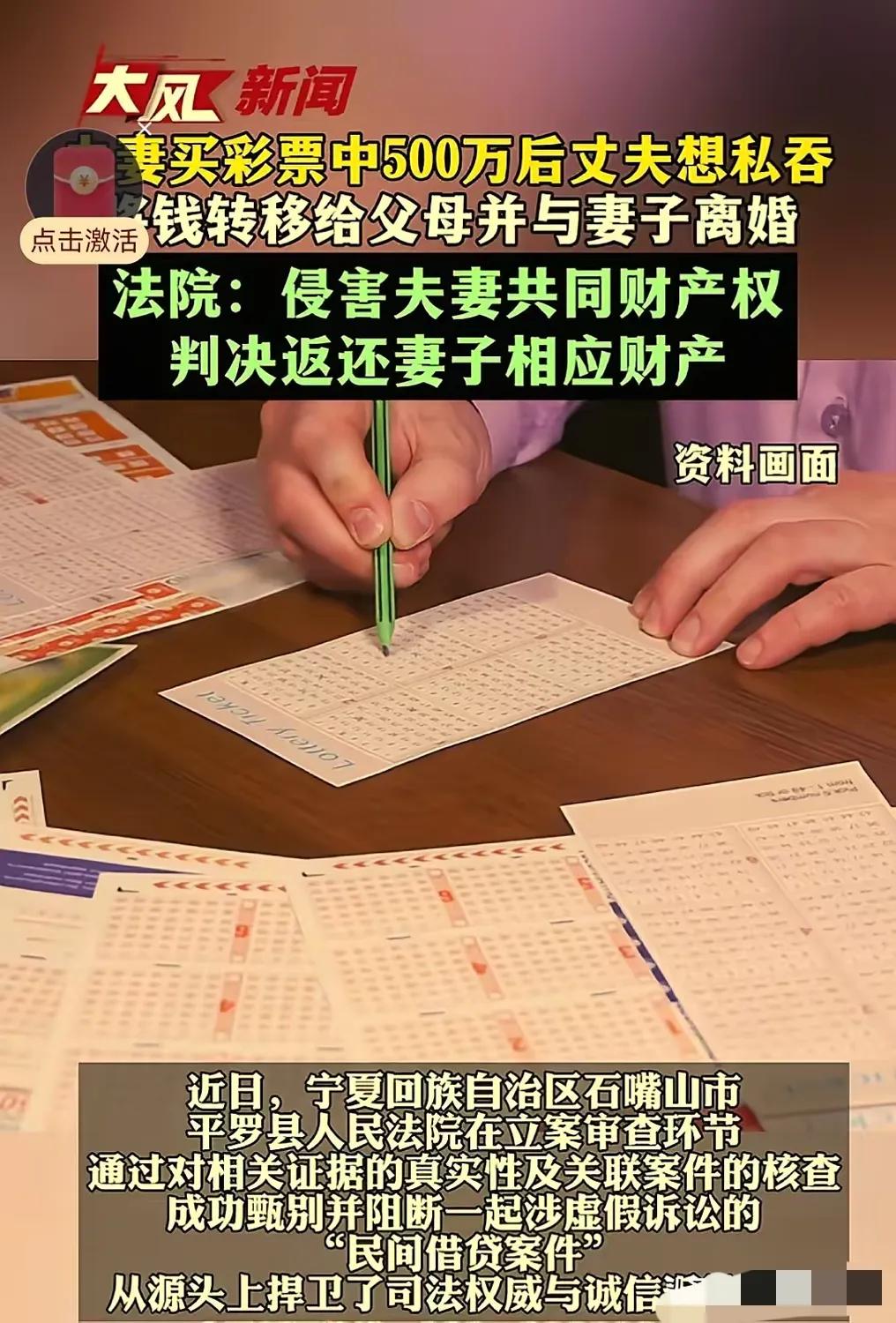 大奖来临先亏妻?宁夏平罗,男子和朋友合伙买彩票,中了500万,两人平分后,男子将200万直接转到父母账户,扭头就和妻子离婚。不久,这事被前妻得知,将男子告上法庭要求平分,法院判男子返还妻子相应财产。男子又和朋友做假局,让朋友拿假借条起诉他还钱。网友:先隐瞒,后转移,就这人品必须离! 俩人当初凑钱买彩票就是图个乐呵,谁也没当真能中大奖,开奖那天对着号码一对,俩人当场懵了,居然真中了500万。扣完税到手实打实的400万,按事先说好的平分,每人揣着200万,男子揣着这笔钱心里立马打起了小算盘,压根没跟妻子提半个字。 他怕妻子要分这笔钱,回家就找各种由头跟妻子吵,挑妻子过日子的毛病,话里话外全是嫌弃,没几天就冷着脸提了离婚。妻子被他这突如其来的态度搞懵,满心委屈又摸不着头脑,架不住他铁了心要离,最后只能无奈签字。 刚办完离婚手续,男子转头就把200万奖金全转到了父母名下,以为这样就神不知鬼不觉,能把这笔钱彻底攥在自己手里。没成想世上没有不透风的墙,他跟朋友分钱、转钱的事,被熟人无意间说了出去,前妻得知真相后,又气又寒心,这才明白他之前的找茬、离婚全是早有预谋,就是为了独吞奖金。 前妻没忍气吞声,直接收集了他中奖、转款的证据,一纸诉状告到法院。法院审理时明确,彩票奖金是夫妻婚姻存续期间的共同财产,男子隐瞒转移的行为违法,当庭判决他必须向前妻返还应得的份额。 这判决让男子彻底慌了神,他舍不得把到手的钱吐出来,居然脑子一热,找当初合伙买彩票的朋友合计歪招。俩人连夜伪造了一张大额借条,谎称男子中奖后借了朋友一大笔钱没还,让朋友拿着假借条去法院起诉自己,想靠着虚假诉讼,把奖金说成是还债款,这样就不用给前妻钱了。 可假的终究是假的,法院立案后核查证据,很快就发现借条是伪造的,转账记录也毫无踪迹,俩人的谎言当场被戳穿。 其实生活里类似的例子不少,一旦涉及大额利益,有些人就容易迷失方向。但法律从来不会纵容这种歪心思,婚姻里的共同财产受法律保护,虚假诉讼更是触碰了司法底线。别以为耍点小聪明就能瞒天过海,法院的火眼金睛,总能照出那些见不得光的小心思。 各位读者你们怎么看?欢迎在评论区讨论。