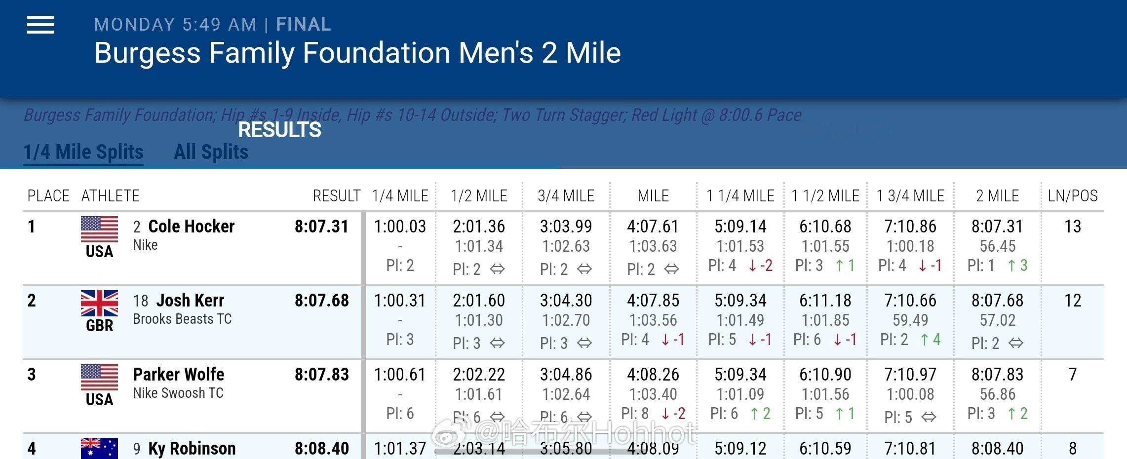 英美这帮中长跑的运动员是挺会整点场外花边新闻的。118届米尔罗斯田径赛2英里🇺🇸霍克8:07.31击败世界纪录保持者🇬🇧科尔夺冠,通过终点对着科尔的方向做了个💤田径说一哈你不知道的田径故事田径