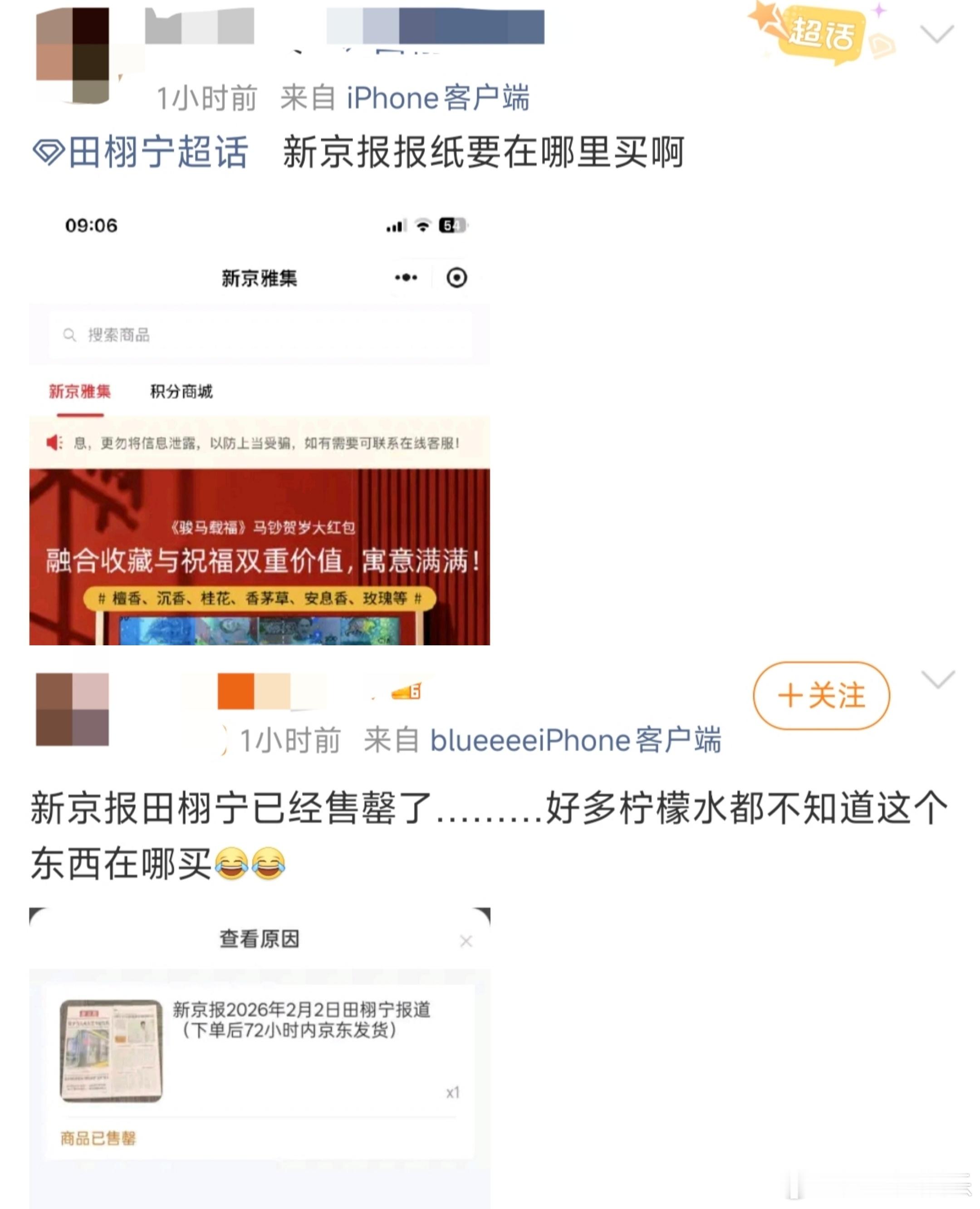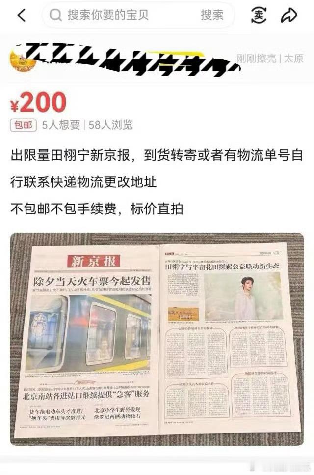田栩宁实体报刊被炒到天价田栩宁 新京报2月2日,“与半亩花田探索公益联动新生态” 登上新京报版面,引发粉丝抢购热潮,相关实体报纸开售后迅速断货,成功购得者晒单庆祝,同时也有大量粉丝反馈“未找到入口”“没抢到”。甚至有二手平台出现高价求购帖。同日,田栩宁还将登上《人民画报》开年刊封面,被粉丝称为“官方严选根正苗红的青年演员”。据悉,田栩宁与国货品牌半亩花田的合作从商业代言进阶至公益领域,田栩宁被正式任命为“半亩花田百万棵树计划公益合伙人”。