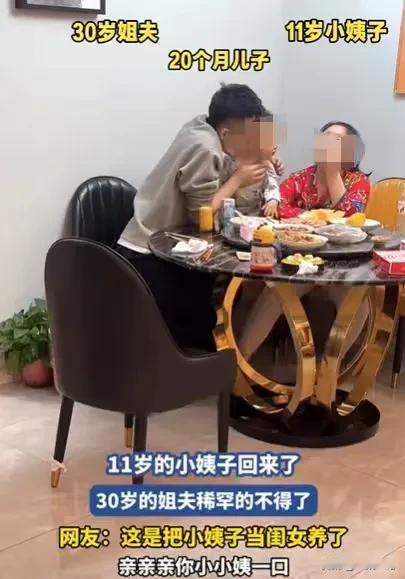“太没有边界感了!”辽宁,11岁的小姨子回来了,开心地吃着东西,30岁姐夫看见了,跟20个月的小儿子说:来,亲小姨一口。接着,他却亲了小姨子一口,亲完之后,哈哈大笑,妻子大喊:“你干嘛呢?” 一个饭桌前,30岁的姐夫,正在照顾20个月的儿子,他开心地和儿子在玩耍,小姨子可能是刚回来,看到桌上一桌的美食,就过来津津有味地吃着,姐姐在一边忙碌着,记录着这美好的时刻。 一直以来,夫妻俩一直没有女儿,把小姨子当闺女养,姐姐看着自己的丈夫,对自己的妹妹如此好,深感欣慰。 可接下来发生的一幕,让评论区炸开了锅。 只见姐夫开心地和儿子说着话,眼睛看着11岁的小姨子,他跟儿子说:“来来来,亲亲你的小姨。” 说着他并不是让儿子亲,而是他伸过头去,捧着小姨子的脸亲了一口。 听完之后他哈哈大笑,一旁的姐姐大吃一惊,赶紧喊道:“你干嘛呢!” 这个姐夫看到妻子惊讶,还得意地说道:“哪个姐夫敢像我这样!” 说着又哈哈哈地笑起来,此时没人看见姐姐的表情,姐姐正在记录这个时刻,或许在姐姐看来,这是温馨的时刻,她正在记录这美好的时刻。 或许这对于他们一家人来说,大家都没有意见,都习以为常,大家都开心着,但姐姐将这个视频发出来,评论区却热闹起来了。 有人说了,这个姐夫是把小姨子当闺女养,所以才会这么稀罕小姨子,在小姨子11岁的时候,还敢亲小姨子,小姨子也肯定是得到姐姐和姐夫的关爱,所以才会欣然接受姐夫的亲近,姐姐才会记录下这温馨的时刻。 但有人说了,这个姐夫太没有边界感了,再怎么把小姨子当闺女养,也不能在行动上有所越界,毕竟小姨子已经11岁了,作为姐夫应当避一避。女大避父,更是要避姐夫。 毕竟姐夫和小姨子之间的关系,不如亲兄妹这样,姐姐可以亲妹妹,但是姐夫万万不可以亲小姨子,这不能有半点越界。 更有人说,这个姐夫有问题,可能不是把小姨子当闺女养那么简单,而是目的不纯,有了第1次,就会有第2次。 家贼难防,如果姐夫真的目的不纯,事情就复杂了,小姨子就危险了。 大家看到这样的事情,真是热议纷纷,有人替小姨子担心,有人觉得小姨子有这样的姐夫是件开心的事,毕竟姐夫像父亲一样疼爱她。 也许事实上,小姨子确实是把姐夫当成了父亲,姐夫也把小姨子当成了闺女,把她当闺女一样养,所以他的妻子才会帮忙记录这样温馨的时刻。 这本家人看待这件事情,他们本身是开心的,倒是网友们的评论过虑了。 不管大家的看法如何,这件事,只要姐姐是同意的,小姨子是乐意的,姐夫是开心的,那这件事本身没有什么问题。 只是小姨子11岁了,在这个年龄段,30岁的姐夫亲小姨子,确实有点让人觉得奇怪。 如果这是他们一家人的日常,平时如此相处,大家都这么开心,证明一件事情,他们有着优良的家风。 《民法典》第1043条规定:家庭应当树立优良家风,弘扬家庭美德,重视家庭文明建设。夫妻应当互相忠实,互相尊重,互相关爱;家庭成员间应当敬老爱幼,互相帮助,维护平等、和睦、文明的婚姻家庭关系。 在这样优良的家风中,姐夫才敢这样亲小姨子。 如果这不是一家人的日常,小姨子不同意,姐姐也反对,那么姐夫的行为就不妥当了,姐夫的行为有可能会成为小姨子的阴影,毕竟小姨子已经11岁,有自己的独立思想,对这件事会有自己的看法。 但是如果小姨子真把姐夫当父亲,一切都可以理解,他们本家人乐在其中就行了。 那么你对姐夫这样的行为有何看法?