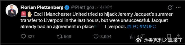 天空体育记者普列滕伯格透露曼联在最后时刻试图截贾凯转会利物浦的交易,但未能成功。