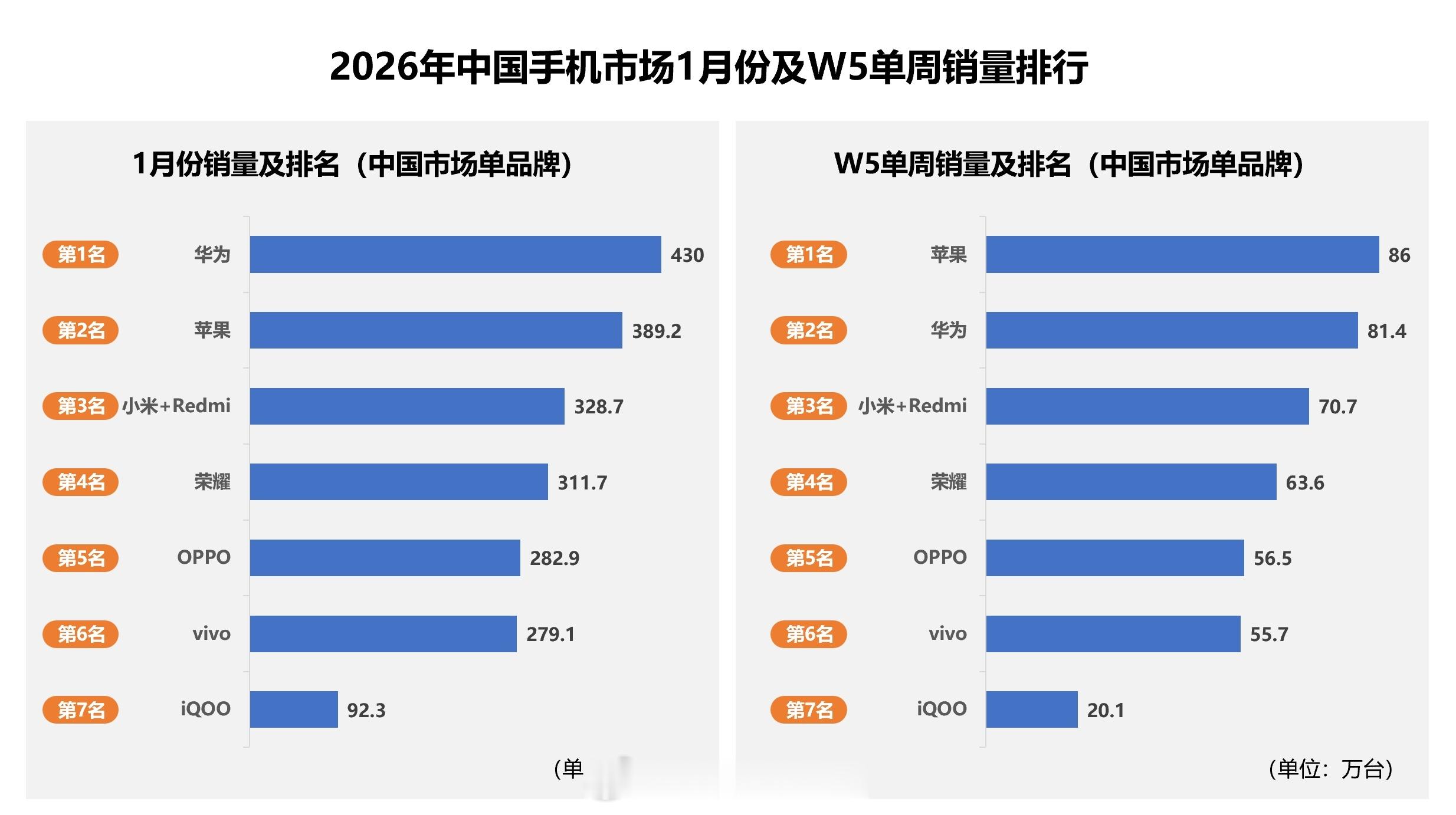 根据市场调研机构数据,2026年首月中国市场单品牌销量排名前六分别是华为、苹果、小米+Redmi、荣耀、OPPO、vivo、iQOO。1月的最后一周即W5的销量排名前六分别是苹果、华为、小米+Redmi、荣耀、OPPO、vivo、iQOO。对比2025年12月,苹果销量出现略微下降,其他各家均有增长。其中荣耀增长超20%,是1月份增长幅度最大的单品牌,耀子可以的
