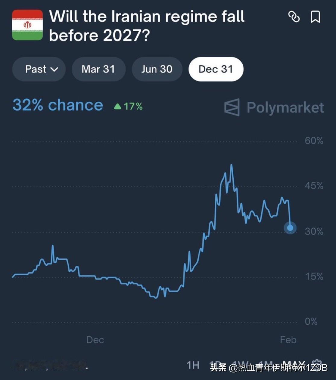 尽管谈判和潜在协议现在看来是有可能的,但 Polymarket 上的交易员仍然不相信伊朗政权会很快更迭,伊朗政府在 2027 年之前垮台的可能性目前为 32%,比上周五下降了近 10%。伊朗