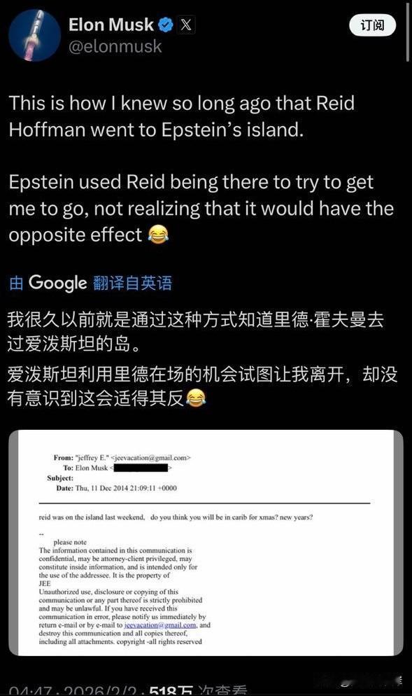 马斯克:这就是我很久以前就知道 Reid Hoffman 去过 Epstein 岛的方式。 Epstein 利用 Reid 在那里这件事试图让我去,却没意识到这会产生相反的效果 😂