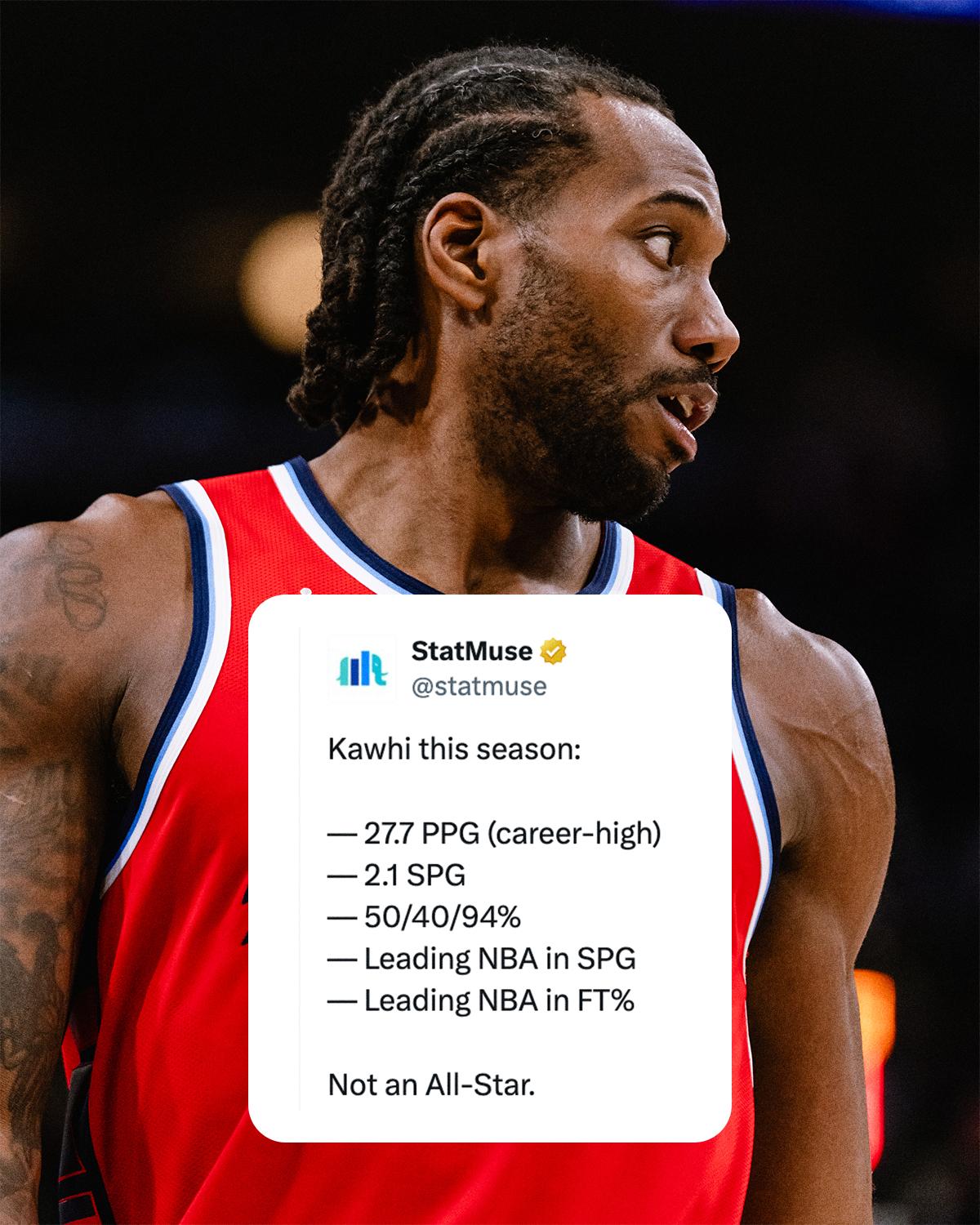 小卡都已经场均27.7分+180俱乐部+抢断联盟第一了,这样都没进替补阵容,想想还是觉得不可思议,好歹也是快船自己的主场啊,居然一个全明星都不给吗?快船要是赛季初的状态也就算了,整个1月都打出“月最佳”的表现了,怎么还是没有球员入选啊? 之前还幻想过,今年快船是东道主,有没有可能小卡和哈登都进全明星呢?虽然觉得哈登确实希望不大,西部后场太卷了,但没想到连小卡都没进。