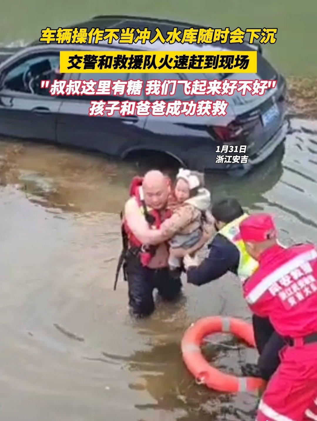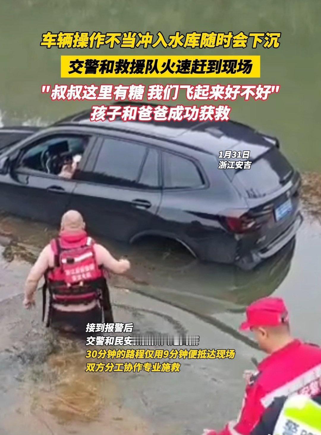 近日,湖州安吉。有车辆操作不当冲入水库,随时有下沉危险,交警和救援队立即行动,30分钟的路程仅用9分钟抵达现场,双方分工协作专业施救,“叔叔这里有糖”“我们飞起来好不好”,孩子和爸爸成功获救