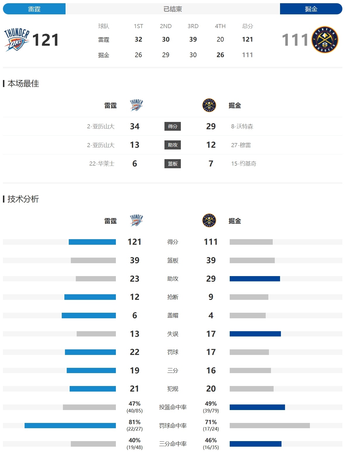 全场比赛结束,雷霆客场121-111酣畅淋漓拿下掘金拒绝连败!