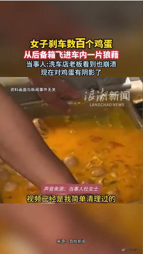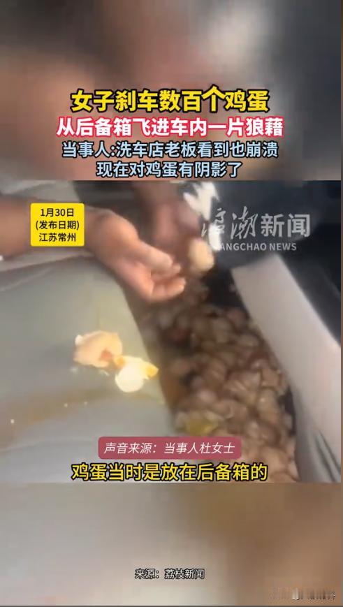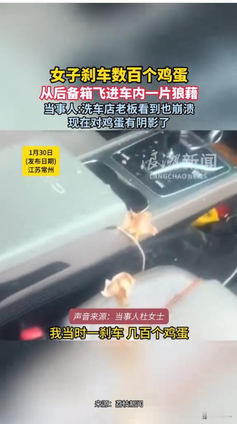 “哭笑不得!”近日,一女子在菜市场买了一大箱鸡蛋,不料开车回家途中遇到突发情况,紧急刹车后,后备箱里的数百个鸡蛋瞬间冲破隔板飞进车内,顿时蛋液、蛋壳糊满整个车厢,连洗车的老板看见都手足无措。网友:怎么放的,心真大啊! 春节临近,不少人会采购大量年货放在车上,但如果后备箱物品没有固定好,遇到急刹车或碰撞时,就会因惯性飞出,不仅造成财物损失,还可能砸伤车内人员。 据媒体2月1日报道,杜女士当天刚从老家带回几百个鸡蛋,想着分给亲戚朋友,就直接把装鸡蛋的纸箱放在了后备箱,但却没有做任何固定。行驶途中,前方车辆突然变道,她下意识猛踩刹车,巨大的惯性让鸡蛋瞬间冲破了后备箱与车厢之间的隔板,飞进了前排和后座。 等她缓过神来,发现车内已经一片狼藉——蛋液顺着座椅往下流,蛋壳碎渣布满地毯,连中控台上都糊着蛋黄。甚至自己的身上头发上都粘上了蛋液,一度非常崩溃,再也不想看见鸡蛋了。 随后,杜女士将车上的鸡蛋进行了简单的处理,开车到洗车店洗车。而洗车店老板看到这场景后直言无处下手。杜女士表示,自己现在看到鸡蛋就头疼,都有阴影了。 因此也提醒大家,在装载易碎物品时,要使用防滑垫或绑带固定,避免因为急刹、颠簸等情况导致物品移位,发生事故。 信息来源:《女子一刹车几百个鸡蛋飞出来碎了,几百个鸡蛋碎车里洗车人懵了》浪潮新闻