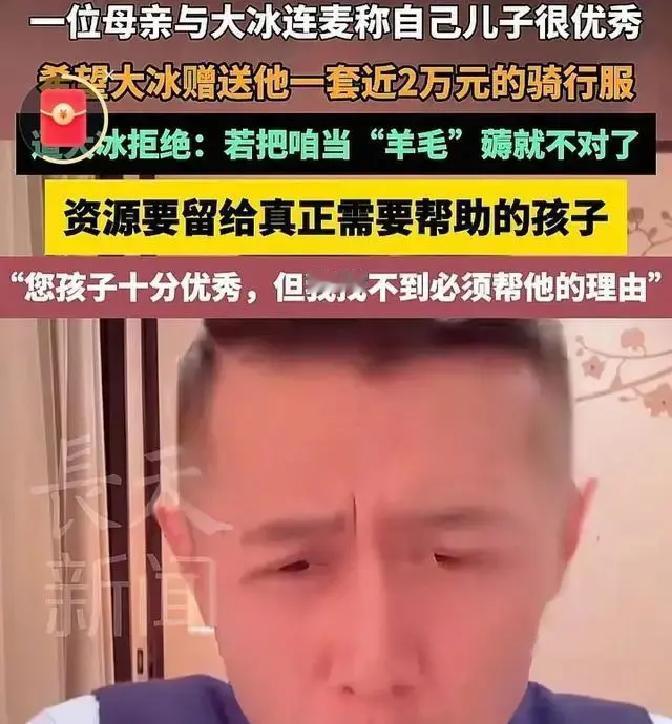 1月19日山东泰安,一位母亲在大冰直播间连麦,直接开口要一套两万元的骑行服给19岁儿子,理由是孩子是全国中学生运动会400米冠军、山东大学特长生。 大冰听完当场拒绝,说主动要的东西他不给,这句话瞬间点燃全网争论。 事情核心很简单,少年有成绩有光环,母亲却把冠军当成了开口要礼物的通行证,而不是自己去努力攒钱或找正规赞助。 后续大家挖出,这位母亲账号经常参与各种抽奖薅羊毛,从小家电到机票都不放过,习惯了零成本获取。 而大冰直播后台,类似求助私信超两千条,有人P假病历,有人造残疾证明,各种套路层出不穷,说明这种“先秀人设再道德绑架”的操作已经成流水线了。 拒绝其实是在守底线,资源该给真正走投无路的人,而不是帮别人满足虚荣或额外享受。 数据显示,直播平台近几年严打诱导和虚假求助,2025年一季度抖音就永久封了上千个靠情感伪装骗打赏的账号,违规举报量降了七成多,说明假故事确实挤占了真需求的空間。 家长心态也值得警惕,很多“优秀”孩子的家庭潜意识里觉得成绩就能换特权,从学校插队到生活福利都想优先,这套逻辑直接搬到直播间,冠军头衔瞬间变优惠券。 可体育训练最缺的不是装备炫耀,而是面对拒绝还能继续咬牙坚持的韧性。 大冰以前送过吉他、电脑给需要把东西变成谋生工具的人,这次骑行服对职业选手是必需,对业余或有光环的少年,更像是锦上添花的装饰。 边界感才是真善意,无限满足只会让人失去自己争取的动力,长远看害大于利。 少年真正需要的,是学会“要不到就靠自己挣”的那份硬气,而不是总指望别人代付人生账单。 世界从不会因为奖牌就自动让路,成长的底色是自己掏腰包买单,哪怕慢慢分期,也比分分钟伸手更有尊严。