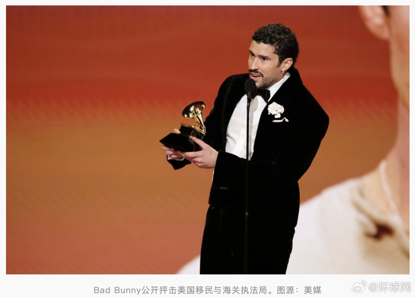 #多名歌手在格莱美颁奖礼喊话ICE#【“废除ICE”!格莱美颁奖典礼上,比伯、“碧梨”、Bad Bunny等多名歌手公开反对美政府移民执法行动】#碧梨比伯等在格莱美公开反对ICE# “ICE out(废除美国移民与海关执法局)!”近期美国联邦政府移民执法行动在明尼苏达州接连发生致命事件,引发多个民主党主政地方政府与当地民众强烈抗议和对抗。据哥伦比亚广播公司(CBS)、《纽约时报》等多家美媒报道,在当地时间2月1日晚举行的格莱美颁奖典礼上,包括美国女歌手“碧梨”比莉·艾利什、波多黎各歌手Bad Bunny等在内的多名艺人公开反对美国政府的移民执法行动。