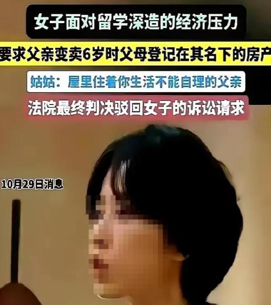 珠海法庭上,一个要出国留学的女儿,当着自己半瘫的爹,指着照顾爹的亲姑姑,声音清脆:“这是我的房子,她必须搬走” 那本红艳艳的房产证,安静地躺在珠海法庭的桌面上。 登记在女儿名下的这套房产,是父母在她六岁时赠与的礼物,本意是给她未来一个保障。 谁也没想到,十几年后,这本证书会成为父女对簿公堂的焦点。 父亲的人生在2010年发生转折。 一场突发脑梗让他经受了开颅手术,最终落下二级伤残,左半身几乎瘫痪,生活无法自理。 更不幸的是,三年后夫妻感情破裂离婚,女儿跟随母亲生活,从十二岁起就与父亲渐渐疏远。 在父亲最需要照顾的时候,他的姐姐,女儿的姑姑主动担起了照料责任。 她不顾自己老家还有老人需要赡养,坚持两头奔波,为了更方便照顾弟弟,住进了这套房子。 日复一日的端茶送水、擦洗护理,她从未索取过任何报酬,全靠姐弟亲情支撑着这份付出。 而此时,女儿正在国外求学。 当她面临继续深造需要资金时,将目光投向了这套登记在自己名下的房产。 她认为房产证上既然是自己的名字,处置权自然归她所有。 在她看来,病重的父亲可以另行购房或租房居住。 法庭上,她指着姑姑声称对方侵占房产,却忘了正是这位姑姑替她尽了赡养父亲的义务。 她坚持认为法律应该保护物权登记,却忽略了房产是父母出资购买并赠与当时年仅六岁的她这一事实。 法官在审理中发现,女儿名下并非只有这一处房产,她还有其他可供处置的财产来源。 所谓急需资金的说法难以成立,相反,父亲因长年治病早已身无分文,这套房子是他唯一的容身之所。 一旦搬离,他将面临无家可归的困境。 法院最终驳回了女儿的诉讼请求,判决指出,虽然房产登记在女儿名下,但这是基于亲子关系的赠与行为。 子女对父母有法定的赡养义务,这种义务不会因父母离婚或随一方生活而消失。 当物权与基本生存权冲突时,法律优先保障人的生存权利。 在这场珠海家庭的房产纠纷里,姑姑依然日复一日地照料着病重的弟弟。 她搬动他无力的肢体,擦拭他额头的汗水,这些细微的动作比任何法律条文都更能诠释家的意义。 父亲沉默地接受着姐姐的照顾,眼中常含着复杂的情绪。 远在国外的女儿或许还在思索判决的深意。 她可能尚未完全明白,那本房产证承载的从来不只是所有权,更是父母当初赠与时那份沉甸甸的爱与期待。 房子之所以成为家,不是因为墙垣有多坚固,而是因为里面住着的人,以及他们之间无法用法律条文完全衡量的情感纽带。 法律保护每个人的合法权益,但更守护着社会最基本的道德底线。 在这起案件中,法院的判决既保障了父亲的生存权,也维护了家庭伦理。 它提醒每个人,在追求个人发展的同时,不能忽视对家人的基本责任。 主要信源:百度百科、网易新闻
