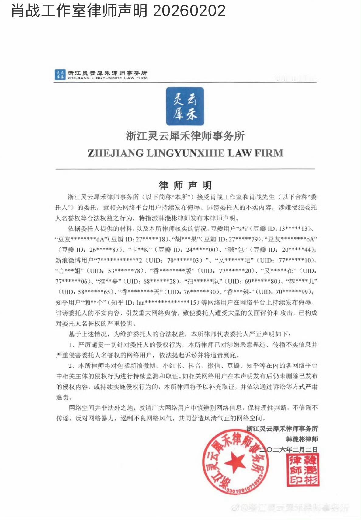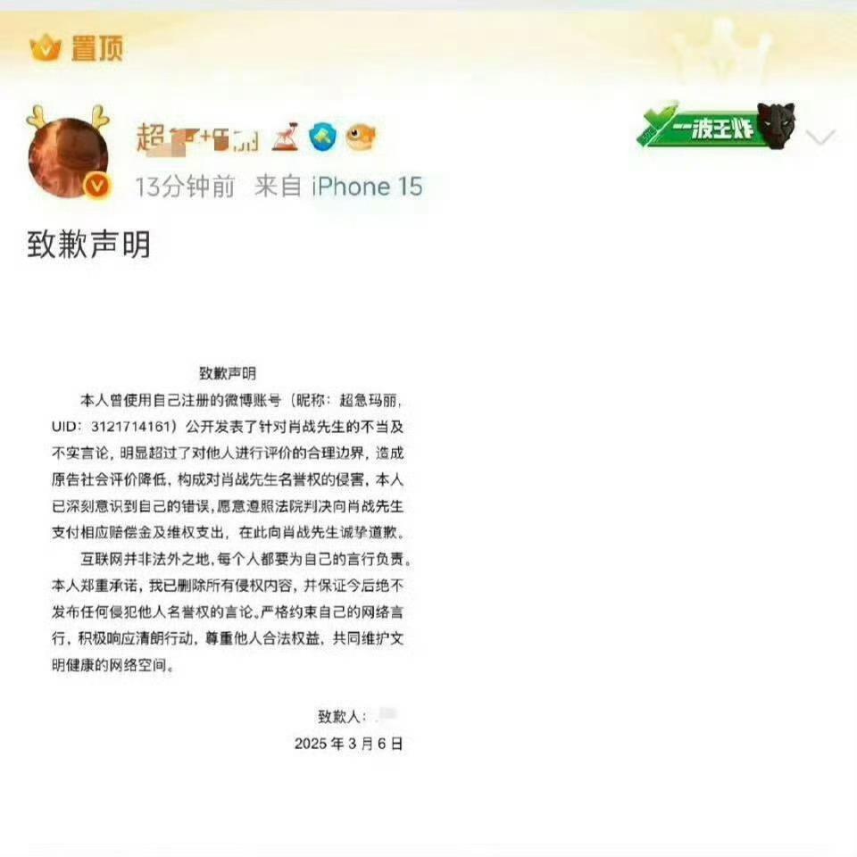 肖战更换律师团队肖战工作室一直在告黑一直在维权,都是实名制,道歉信赔偿一个都不能少,网暴犯一个都别想逃过