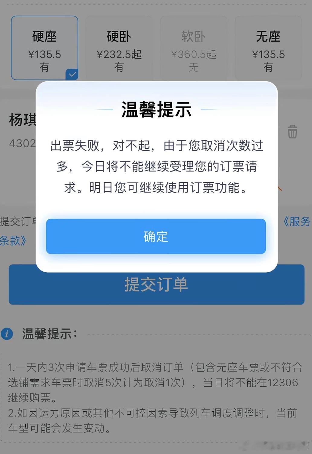 事不过三没毛病,三次机会都不能满足那确实没法了,但是可以用其他账户帮你买,或者是线下购买,12306还是给了容错空间12306取消订单3次当日无法购票