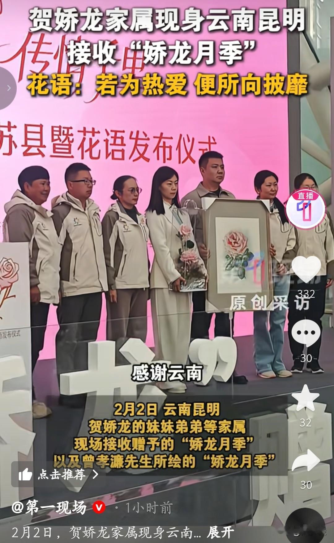 “娇龙月季”的寓意是“若为热爱,便所向披靡”,这正体现了贺娇龙的人生写照! 2月2日,贺娇龙的家属来到云南昆明,接收了这朵以她名字命名的“娇龙月季”,还有曾孝濂先生为它绘制的画作。 这朵花的花语“若为热爱,便所向披靡”,正是贺娇龙一生的真实写照。她扎根基层,为了家乡的发展和牧民的生活奔波,用行动诠释了什么是“热爱可抵万难”。就像这朵月季,坚韧又热烈,在高原上绽放出独属于自己的光彩。 家属在现场哽咽着说“最想讲的就是感谢”,简单的两个字里,藏着对所有记得贺娇龙的人的感激。这朵花不只是纪念,更是把她的精神留在了大家心里。当“娇龙月季”盛开的时候,我们会想起那个为了热爱一往无前的身影,也会记得,只要心怀热爱,平凡人也能拥有所向披靡的力量。