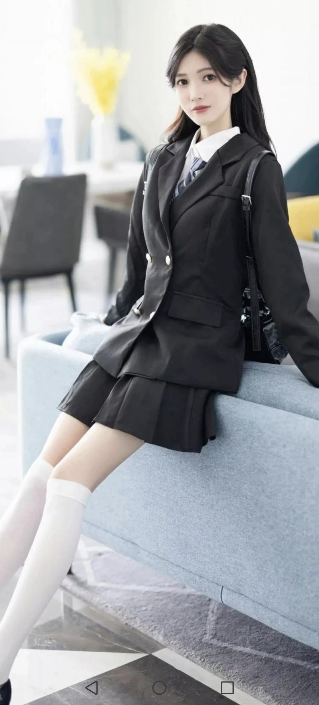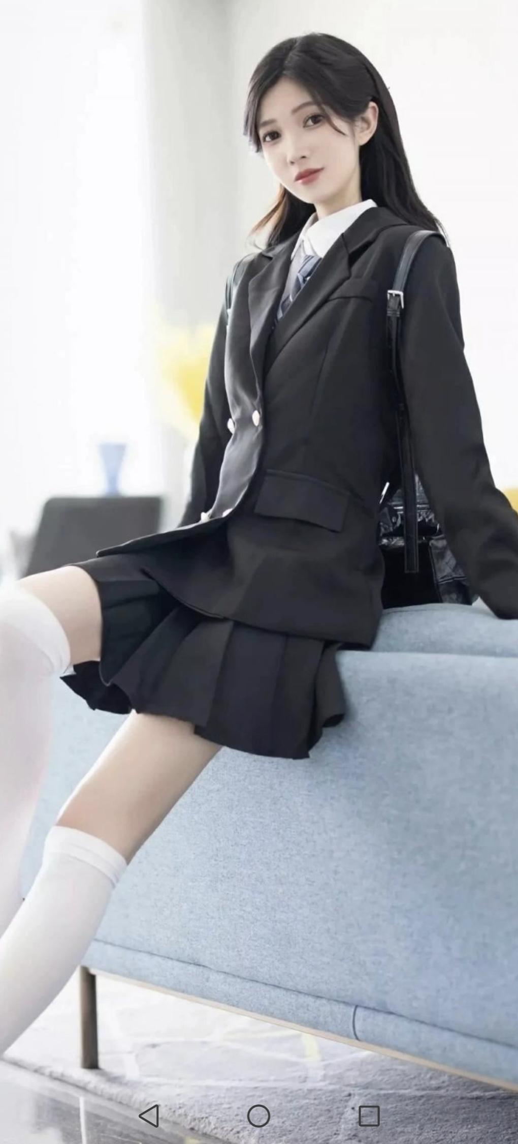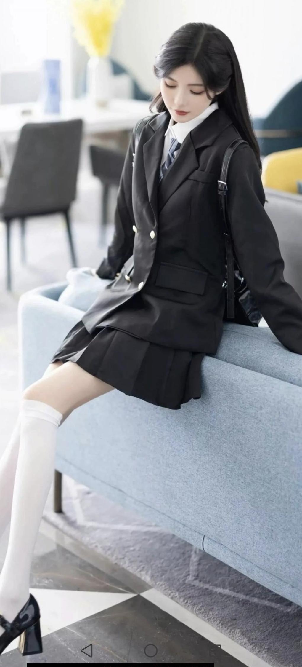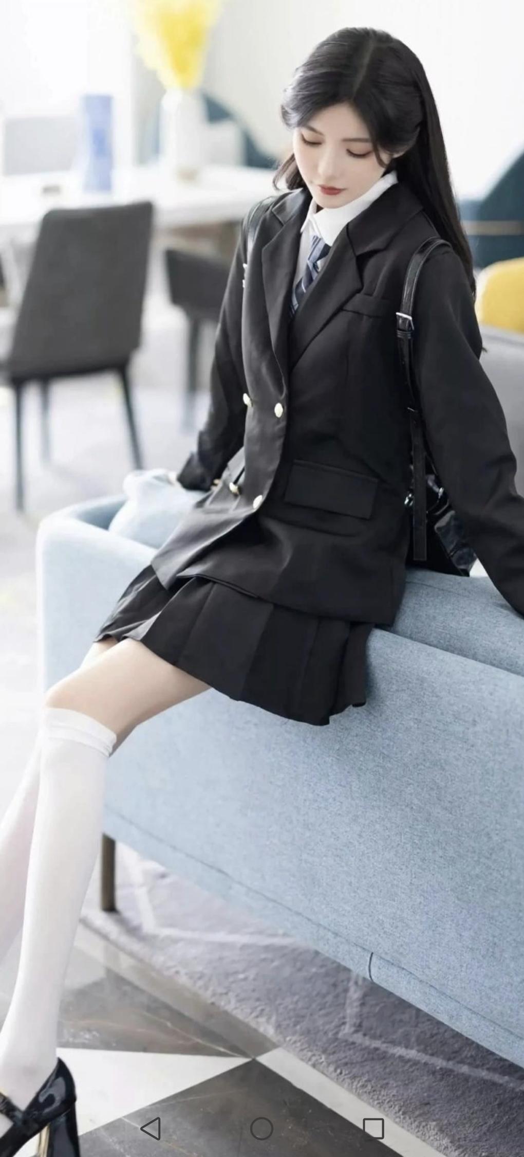 优雅黑裙少女,静坐蓝椅间,气质如画。
