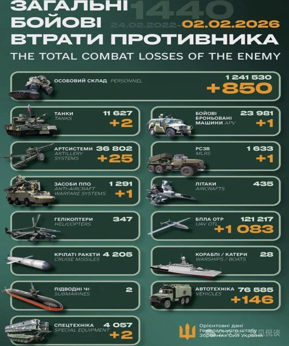 【2026 年 2 月 2 日乌克兰战报 】乌方每天发布而且有累计数,具有连贯性,至少可以看合订本。也欢迎大家转发俄罗斯官方发布带有累计数的每日战报。