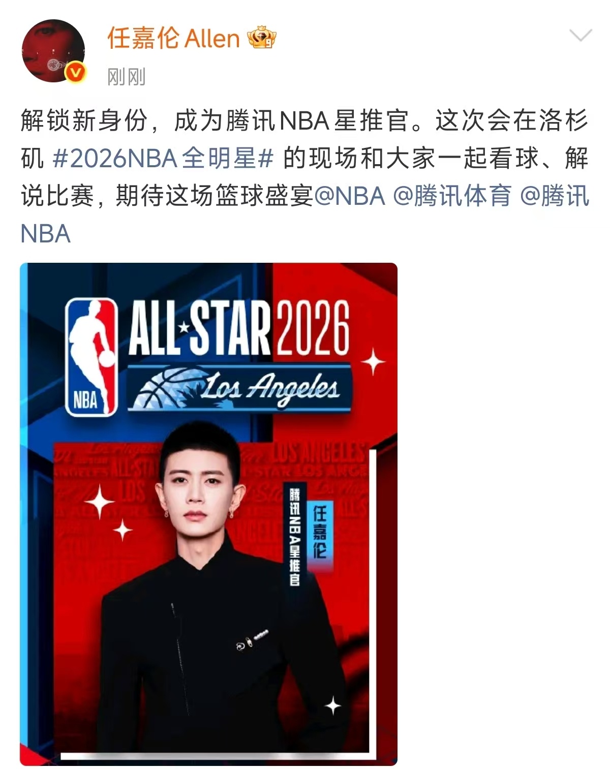 任嘉伦首位NBA全明星解说男演员从荧幕到赛场,任嘉伦解锁NBA星推官身份,成为全明星首位中国解说男演员!洛杉矶现场见证传奇,新春共赴篮球盛宴