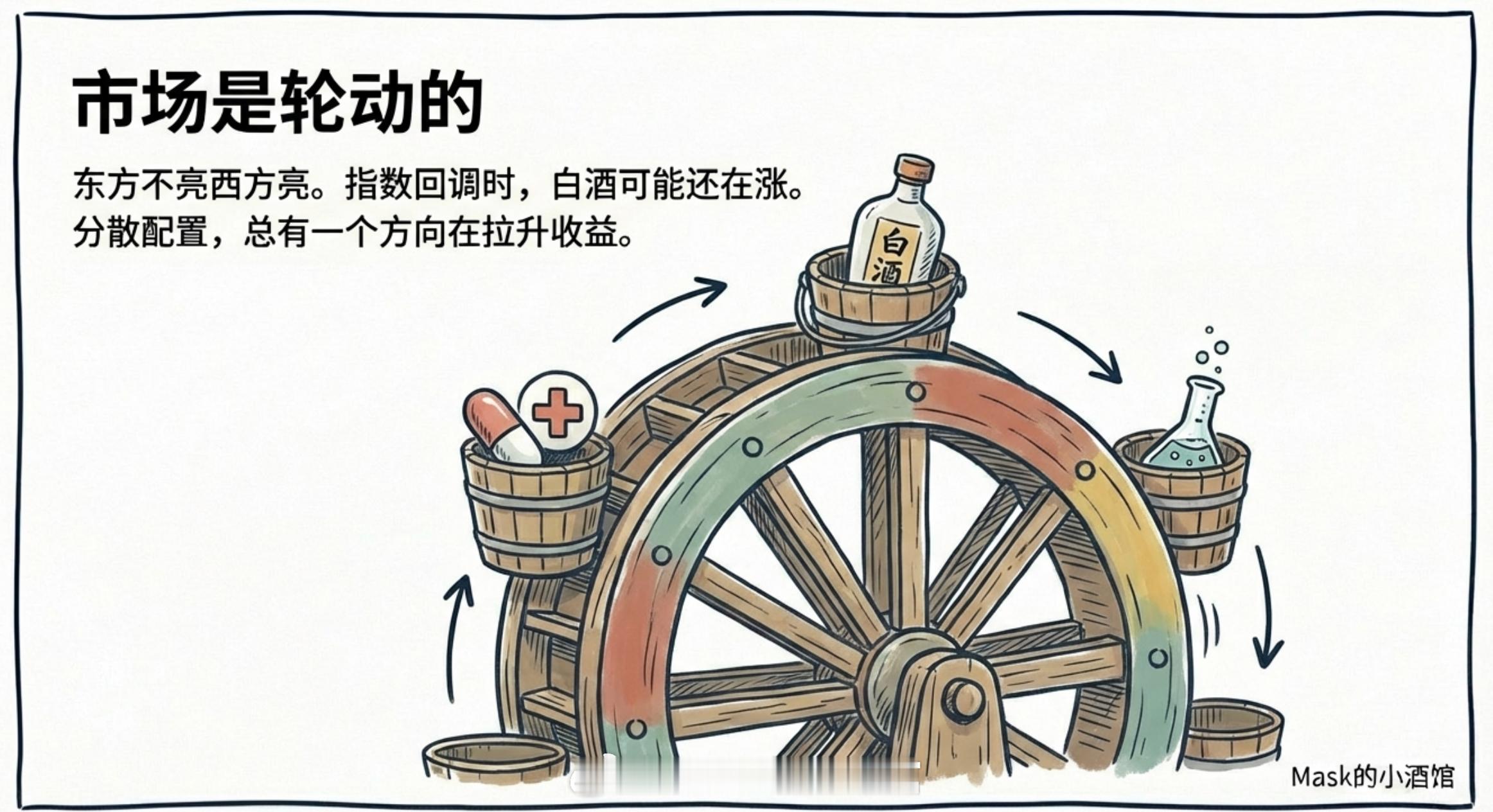 就像这段时间,指数虽然回调了,但白酒还在涨对吧?如果你只买了科技或者军工,现在肯定难受。但如果你配了白酒,白酒的涨幅就能对冲掉其他板块的跌幅。