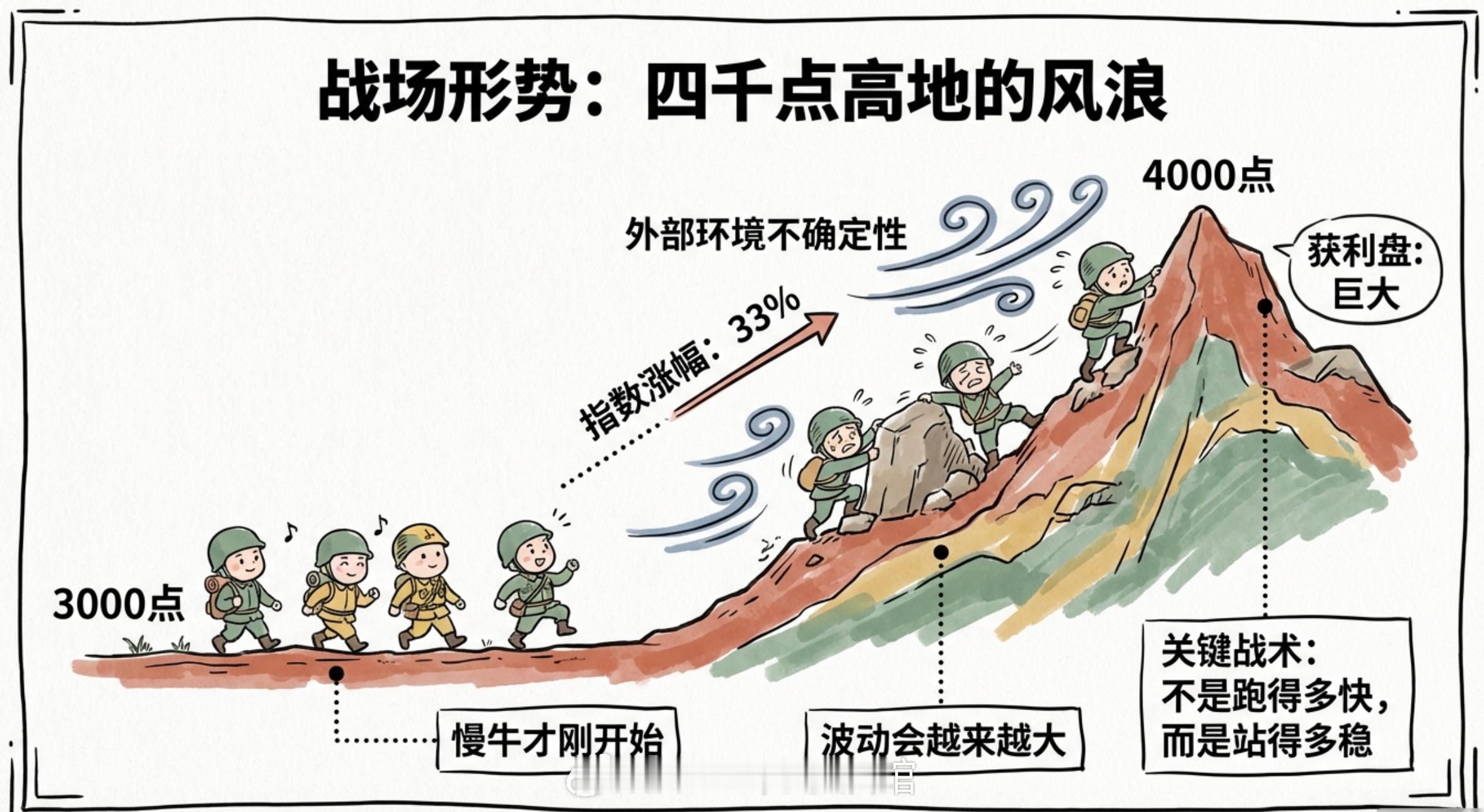 为什么?你想想,指数从3000点涨到4000点,涨了33%,获利盘得有多少?这些人随时可能卖出套现。再加上外部环境的不确定性,市场肯定会反复震荡。这就像爬山,前面是平路,走得轻松。但越往上走,坡度越陡,风也越大,稍不注意就可能滑下去。所以现在的关键不是跑得多快,而是站得多稳。