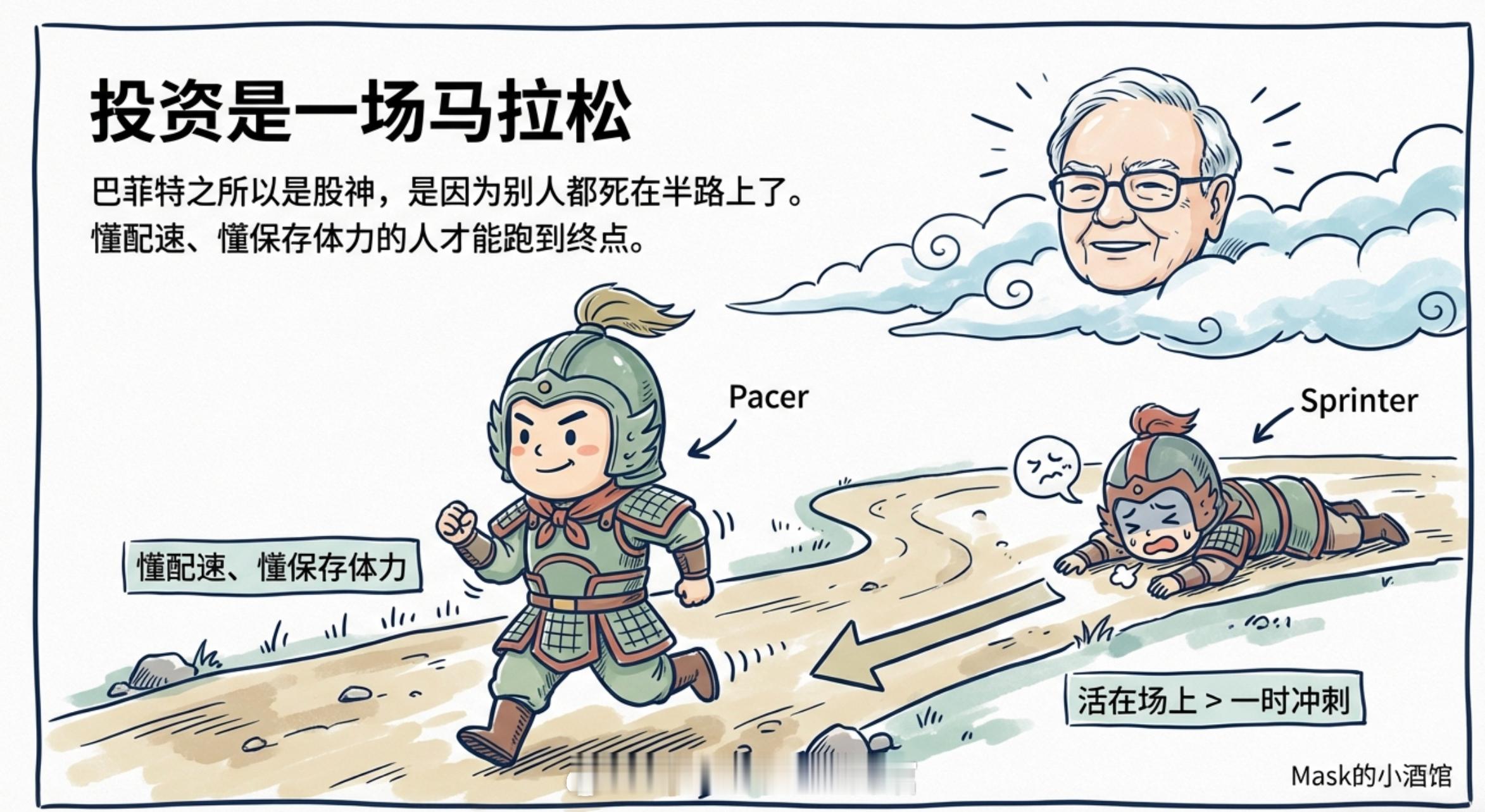 你看巴菲特,他和他同时代的投资人比,技术更牛的有,收益更高的也有。但为什么最后只有他成了股神?因为别人都死在半路上了。这就像跑马拉松,起跑的时候冲得最快的那些人,往往跑不到终点。真正能完赛的,都是那些懂得配速、懂得保存体力的人。