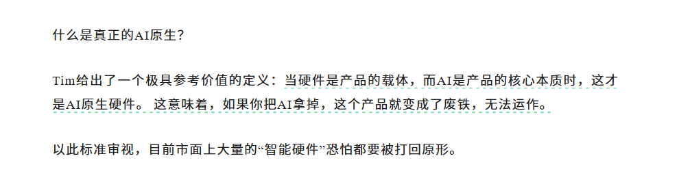 “当硬件是产品的载体,而AI是产品的核心本质时,这才是AI原生硬件。 这意味着,如果你把AI拿掉,这个产品就变成了废铁,无法运作。”