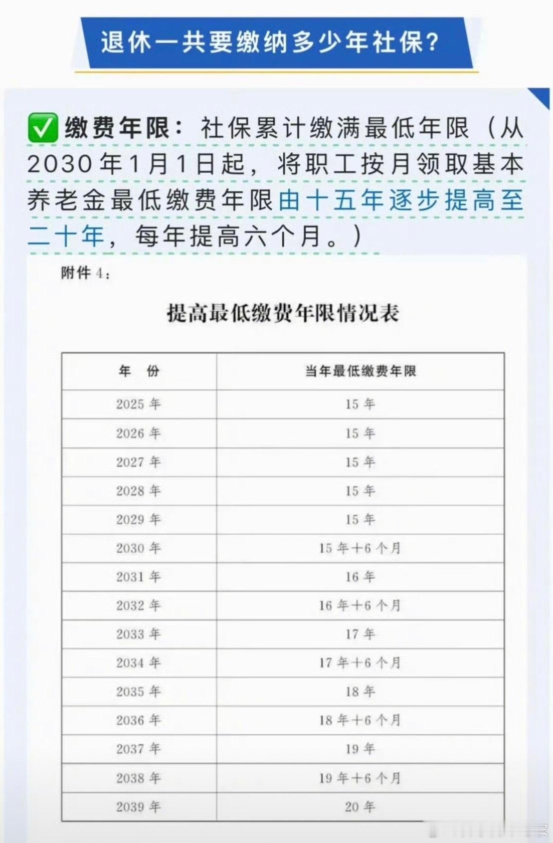 一锤定音,社保逐步提升到20年,也就是2029年之前的还是15年,2029年之后每年➕6个月,直到2039年过渡到20年退休一共要缴纳多少年社保