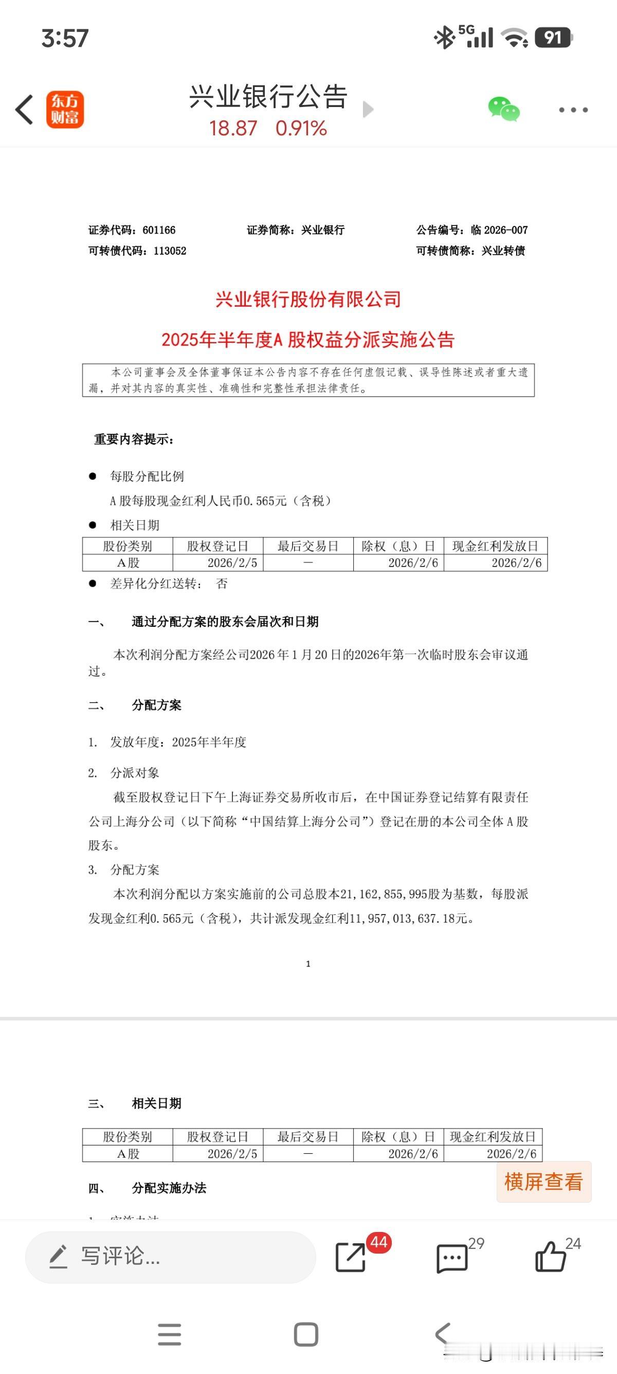 首次的中期分红终于要来了,2月5日股权登记,2月6日除权!按惯例本周四晚间股息就能到账户了! 中期分红后,对应转股价下调至20.63元! 技术面上看,虽日、周、月线趋势走得不理想!但日线已经有企稳迹象,等待下方macd转红,对底背离做个确认[呲牙]! 个人近期无操作,耐心等待中期股息到手,按目前性价比来看,复投是个不错的选择!