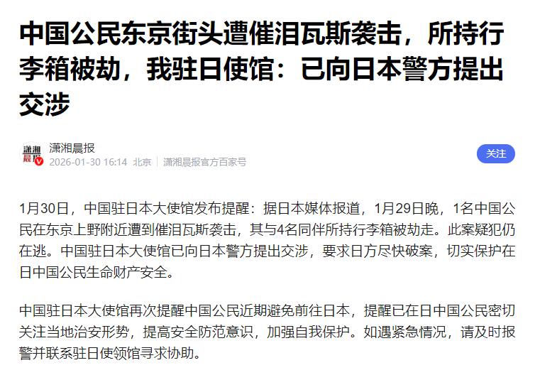 不听劝去日本旅游的华人,终归还是出事了!1月29日晚,1名中国公民在东京上野附近遭到突然遭到催泪瓦斯袭击,与其同行的4名同伴所持的行李箱都被劫走了,而到现在作案分子都没有抓到。看看,日本国内治安明显在恶化。 最近外交部、中国驻日本大使馆,天天喊咱们别去日本,可就是有不少华人不听劝,总觉得“我哪能那么倒霉”。 结果倒好,不听劝的还是出事了,就在1月29号晚上,东京上野街上,一个40多岁的中国男人,正和同伴往车上装现金行李箱,突然冲出来3个劫匪,对着他喷催泪瓦斯,抢走了3个箱子。 里面快2000万人民币,至今劫匪都没抓到。可这还不算完,最近针对中国人的案子,一件接一件。 现在中日局势特别紧张,高市早苗对中国敌意大得很,不光有政客煽风点火,针对中国人的恶性案件也不停。 1月27号,日本山林里发现一具中国女老板的遗体,被人残忍谋杀;1月初,好几名中国公民在日本被无故殴打受伤。 去年12月底,东京新宿还有中国公民被汽车撞伤。这些都是真事,而且日本警察破案率不到5%,凶手基本都能逍遥法外。 更要命的是,日本最近自然灾害也不停,1月份以来,多地下特大暴雪,已经冻死很多人,好多人被困,交通全断。中国人在那,不光要防人害,还要防天灾,简直是祸不单行。 可能有人还抱有侥幸,觉得“我去了不一定有事”,可现在的情况是,日本治安越来越差,抢劫、伤人案天天有,加上高市早苗煽风点火,极端分子盯着中国人,还有不停的天灾,中国人在那,随时随地都可能遇到危险。 中国大使馆早就反复提醒,从一开始说“谨慎去”,到后来喊“别去”,就是怕咱们中国人出事。可还是有人不听,总觉得别人没事,自己也没事。 我今天就把话说明白,现在中国人去日本、待在日本,本身就是一件很危险的事。不是运气不好,是日本现在的局势、治安、天灾,还有针对中国人的敌意。 早就把危险降到了每个人身上。别再抱着侥幸心理拿自己的命开玩笑,不听国家的提醒,真等出了事,再后悔就晚了。