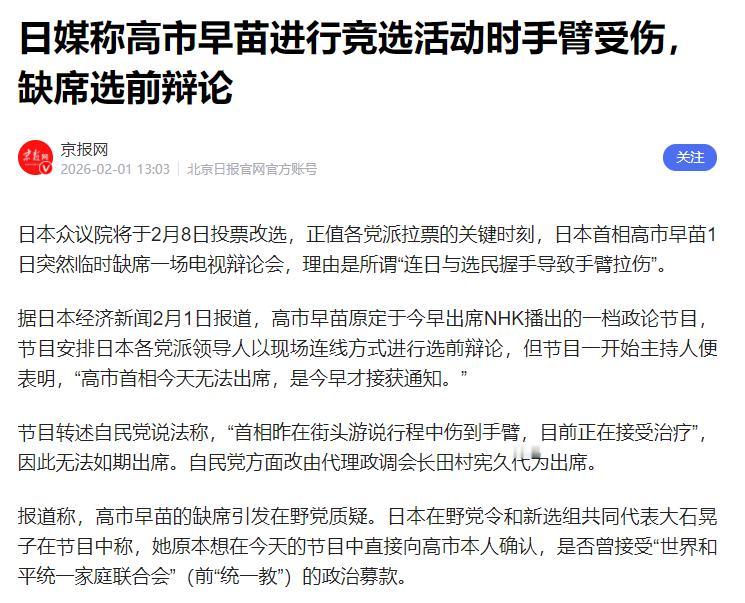 日本无语,首相伤退 没想到,在见完英国首相斯塔默之后,日本首相高市早苗竟然宣布因为手臂受伤而缺席周日的辩论节目,这也导致日本上下产生了质疑。 不管是日本其他党派的人,还是普通老百姓,几乎都觉得,她根本不是真受伤,就是故意找借口,不想去辩论。 这场辩论可不是随便播播的节目,是选举前特别重要的一场直播,老百姓和其他党派,都想借着这场直播问她点实在事。 比如这次选举到底是为了啥,能不能让老百姓的日子好过点,尤其是现在日元不值钱,买进口的油和粮食都比以前贵,大家都想让她给个准话。可偏偏这时候,她却说受伤来不了,换了别人替她去,任谁都会多想。 面对大家的质疑,高市早苗自己出来说了,说她最近跑竞选,跟支持者握手的时候,被人用力扯了一下,再加上她自己胳膊本来就有关节炎的老毛病,导致胳膊受伤、双手肿了,实在没法参加辩论。 她还特意发了消息,说已经让医生处理过,胳膊也缠了绷带,看起来好像真的伤得不轻。 可这话刚说完,转头她就又说,当天下午要去两个地方搞街头演说,行程一点都不耽误。这就太离谱、太矛盾了,明眼人一看就不对劲。 大家想想,辩论就是坐着说说话,不用来回跑,也不用跟人握手,对胳膊几乎没什么负担。 可街头演说不一样,要站着讲,还要跟现场的人互动、握手,比辩论累多了,对受伤的胳膊负担更重。 要是真的伤得连坐着辩论都不行,怎么可能还能跑两个地方,站着搞演说?而且还有个可疑的地方,节目组直到开播前30分钟,才接到她缺席的通知。 搞得节目组手忙脚乱,这也太临时了,更让人觉得她是早早就想好要逃避,不是突然受伤的。 其实大家之所以这么怀疑,不光是因为她的话前后矛盾,更因为这场辩论上,有很多她答不上来的尖锐问题,她就是怕被人当面问住,才找了受伤这个借口。 不管是其他党派,还是日本老百姓,都不买她的账。有人吐槽,她早不伤晚不伤,偏偏要被问问题的时候受伤,明显就是算计好的,怕在电视上被问得说不出话,丢了选票。 大家心里都清楚,她根本不是真的在乎自己的伤情,就是打着受伤的幌子,逃避辩论。 她想靠着“带病竞选”的样子,博大家同情,多拿点选票,可她忘了,老百姓要的不是这种虚假的敬业,是敢作敢当、能正面回答问题、真能为老百姓办事的首相。 她这么一搞,不仅没平息大家的质疑,反而让更多人不信任她,也让日本的选举变得更乱。说到底,她就是把自己的政治利益放在第一位,根本不管老百姓的需求,也不尊重大家的权利。 现在距离大选没几天了,这场“受伤缺席”的闹剧,最后会影响到选举结果不好说,但可以肯定的是,她这波操作,已经丢了很多老百姓的信任。 想在选举中站稳脚跟,恐怕没那么容易了。老百姓心里都有杆秤,谁是真心办事,谁是找借口逃避,大家看得一清二楚。