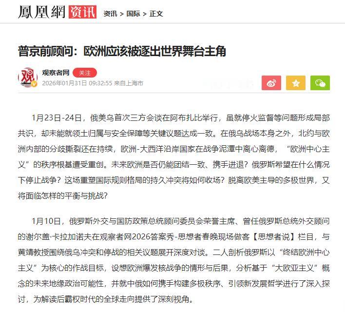 普京前顾问放狠话:欧洲别再当世界主角,赶紧退回自己该待的位置 最近有个消息,大家可能也听说了,俄罗斯有个大人物,以前给普京当过外交顾问,名叫谢尔盖·卡拉加诺夫,他在1月10号接受采访时,说的话特别直接。 他直言:欧洲不配再当世界舞台的主角,得退回到13、14世纪时的样子,以后也不能再抱团结盟了。 有人可能会问,这人说的话管用吗?跟大家说,他可不是普通人,现在还是俄罗斯外交和国防相关顾问委员会的荣誉主席,是懂国际局势的顶尖人物,写过不少相关的书。 他的话虽然不能代表俄罗斯政府,但能实实在在反映出俄罗斯上层人物对欧洲的看法,不是随口乱说的。 他明确说,希望俄罗斯领导人再采取一次行动,而且是最后一次,目的就是不让欧洲再抱团结盟。 为啥他这么反对欧洲结盟?道理很简单,他觉得欧洲老爱挑起战争,每隔100年甚至更短时间,就会搞出大麻烦,最明显的就是一个世纪里,欧洲就打了两次世界大战,害死了好多人,好多国家都被打毁了。 大家对两次世界大战应该有印象,这两次战争都是从欧洲开始的,说白了就是欧洲各国为了抢利益,抱团拉帮结派,最后打了起来,不光自己家打得稀巴烂,还把全世界好多国家都卷了进来。 他觉得,只要欧洲还能抱团、还能当世界主角,以后说不定还会打大战,所以必须让欧洲退出主角位置,再也不能结盟。 可能有人听不懂,让欧洲退回到13、14世纪,到底是啥意思?其实一点不复杂。 就是说,那时候的欧洲没现在这么厉害,既不是世界的中心,也没法抱团形成强大的势力,各个国家各自过各自的,没法主导世界上的事,也没能力发动世界大战,对别的国家也没那么大威胁,他就希望欧洲回到那种状态。 他这时候说这话,也不是偶然,主要是俄罗斯和欧洲的矛盾太深了。自从2022年俄乌打仗以来,欧洲各国就抱在一起,给乌克兰送武器,还制裁俄罗斯,摆明了跟俄罗斯作对。 而且欧洲一直推动北约往俄罗斯边境靠,挤压俄罗斯的生存空间,俄罗斯早就不满了,这就是矛盾的关键。 另外,他还想拉拢美国的一部分势力,这次采访他的就是美国一个保守派媒体人,这部分美国人也对欧洲不满,觉得欧洲拖累了美国。 他说这些话,也是想拉拢这部分人,拆散欧洲和美国的同盟,让俄罗斯更有优势,同时他也希望俄罗斯多和中国、印度等东方国家合作,少跟欧洲纠缠。 那他说的这些能实现吗?其实很难。欧洲虽然现在有不少问题,但经济、科技还是很厉害,各国也不愿意放弃自己的国际地位,那些同盟组织也不是说散就能散的。 所以他说这些话,更多是警告欧洲,表明俄罗斯的态度,不会再容忍欧洲抱团威胁自己。 最后跟大家说,这只是他个人的想法,不代表俄罗斯政府一定会这么做。但这也能看出来,俄罗斯和欧洲的矛盾很深,短期内缓和不了。 对我们普通人来说,了解这些,就是知道现在世界不太平,各国都是为了自己的利益,而和平稳定,才是大家最希望的。