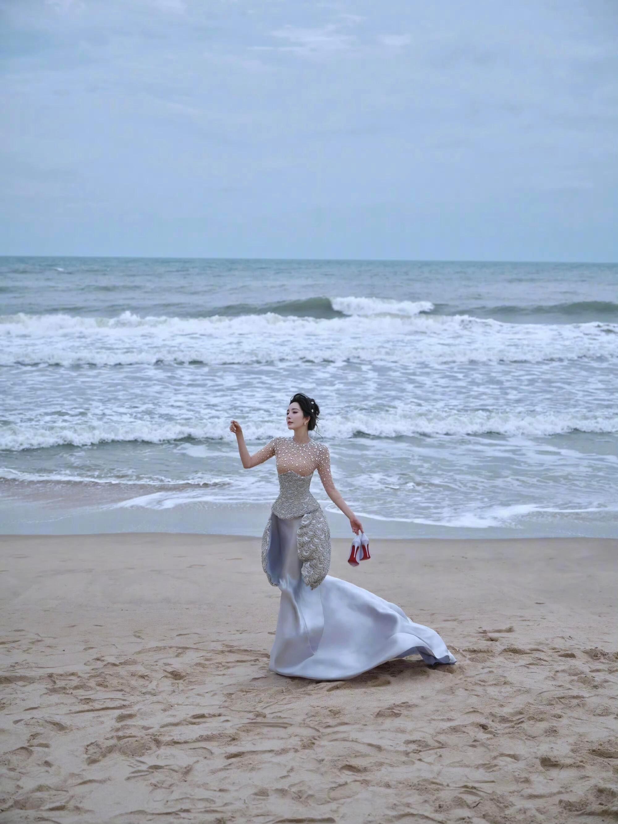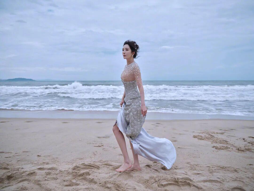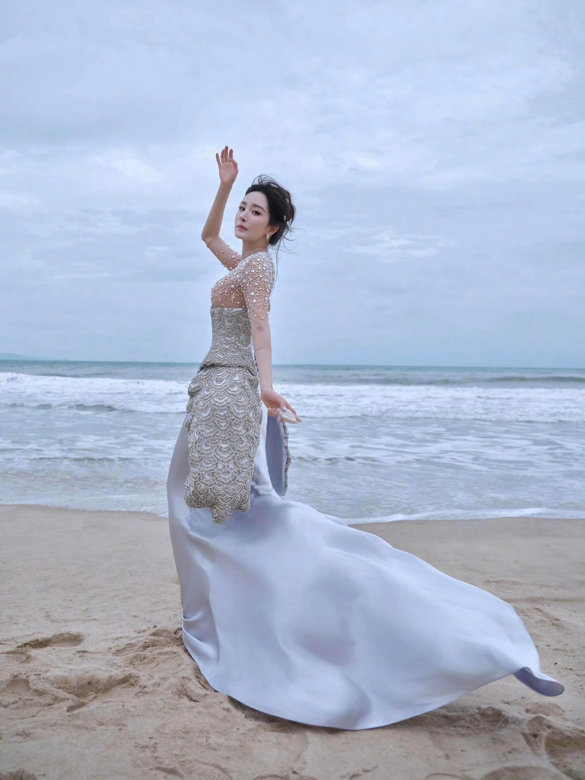 杨幂银色珍珠礼服长裙穿搭