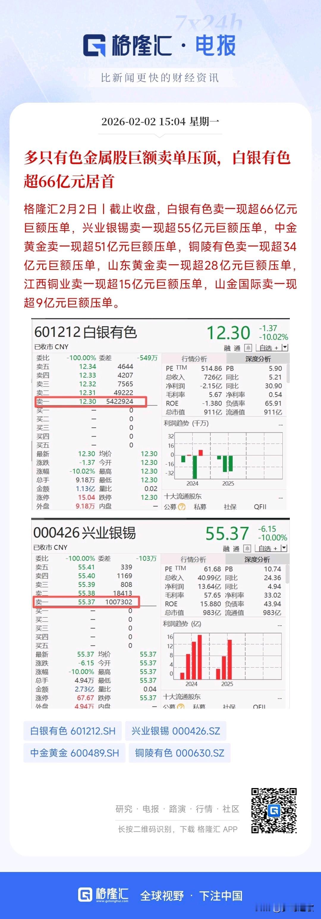 今天A谷大跌的原因很明了,贵金属不止跌停到了尾盘还有巨幅大额压单 今天大跌的原因不用说也知道,就是贵金属再次暴跌,现货黄金和白银目前暴跌4.46%,7.96%,已经连续两天暴跌。 A股的黄金股票和白银相关也是暴跌,黄金ETF直接跌停了,完全不给市场任何反弹的机会,直接带崩了情绪面,造成恐慌性抛盘。 关键的在于收盘还有大额压单,白银有色尾盘遭66亿巨额资金压单,江西铜业,铜陵有色都有大额压单,这和前几天的大额压单老登股何其相似,就是不让涨。 现在大涨是不可能了,大跌出现了,现在就看政策面了,禁止大涨大跌是刚提出来的。