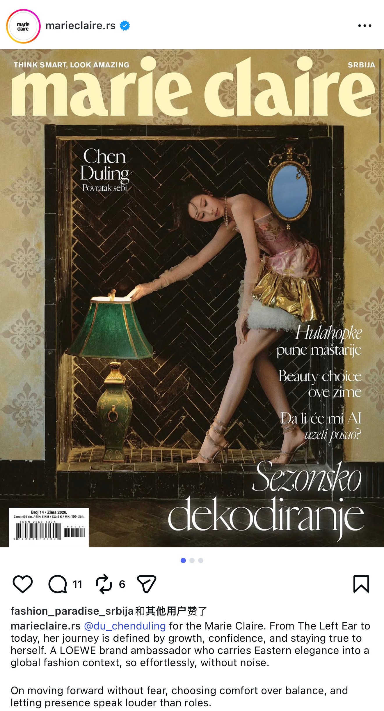 陈都灵身穿Rahul Mishra 2025秋冬最新季高定(拍摄时)搭配MIKIMOTO高级珠宝出镜塞尔维亚版嘉人二月刊封面,作为她的首本海外主流女刊,本次拍摄配置拉满,不仅有高定配高珠的封面曝光,更是有金鹤龙+刘雪亮的国内顶级妆发团队保驾护航,可见杂志对于本次的拍摄重视程度!也侧面见证了爆款剧集对她的事业的强势推动:国民度飞速上涨+海外影响力持续扩散,就这个开年开门红的嘟嘟谁能不爱!