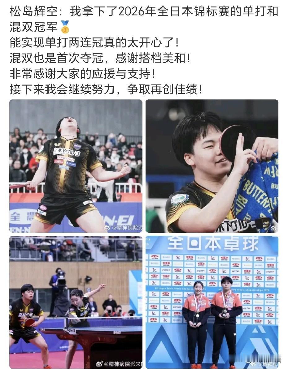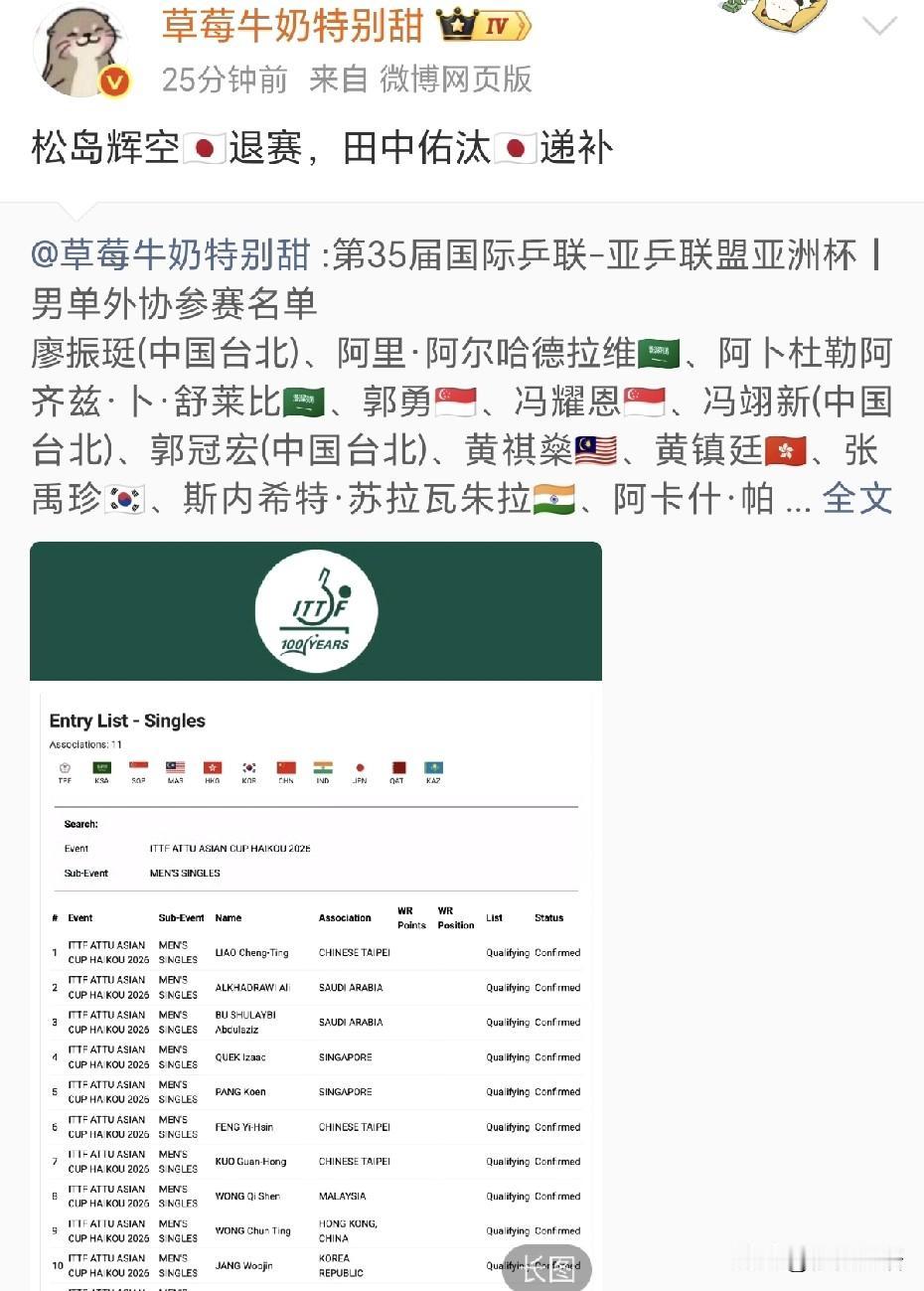 松岛辉空也退出亚洲杯的比赛了。 今年的亚洲杯,看到很多外协选手都退赛了,林昀儒、郑怡静退赛后,就全力备战2月底的新加坡大满贯赛了,大满贯赛冠军有2000积分,亚洲杯冠军有500积分,看来很多人想拿高积分啊。 刚刚看到松岛辉空退赛了,田中佑汰递补参赛,后天比赛就要开始了,今天还有人退赛,看到女单也有2人退赛。松岛辉空是刚刚在日本打完全日锦,他是拿到了男单和混双冠军,实现了男单两连冠,估计权衡之后,还是不参加亚洲杯了,要好好休息,然后备战后面的比赛了。 确实看了全日锦松岛辉空和张本智和的比赛,从松岛辉空的眼神里,就看得出来非常想赢。昨天他和张本美和也拿到了混双的冠军,今年全日锦松岛辉空也拿到不少和牛肉啊,松岛辉空男单夺冠后笑的很开心啊。这次亚洲杯国乒是12人参赛,除了梁靖崑因伤退赛,其他人都参赛了,比赛加油。